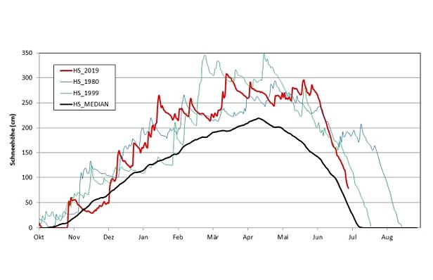 Sur le seul champ de mesure de haute altitude effectuant des relevés depuis de nombreuses années, au Weissfluhjoch à Davos (2536 m, GR), la hauteur de neige a diminué en 29 jours de 193 cm passant de 272 cm le 1er juin (ce qui constituait pour cette date un nouveau record de hauteur de neige) à 79 cm (cf. figure 5 et photo 6). Une diminution si importante en juin ne s’est encore jamais produite au cours des 83 années depuis le début des mesures au Weissfluhjoch. Le mois de juin avec la deuxième valeur la plus importante de diminution de la hauteur de neige (en 1970) atteignait „seulement“ 155 cm. La date moyenne de fonte totale de la neige au cours des 30 dernières années à cette station est le 6 juillet. Selon les prévisions, la neige disparaîtra totalement du champ de mesure cette année seulement quelques jours plus tard, malgré l’énorme hauteur de neige de début juin.