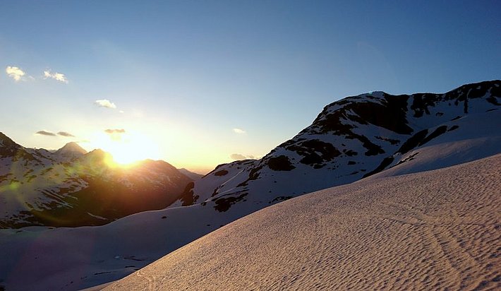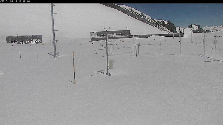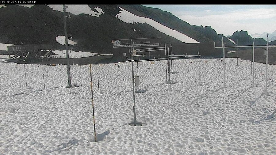 Une situation anticyclonique stable s’est installée sur l’Europe centrale. De l’air très chaud en provenance du Sahara était acheminé depuis le sud-ouest sur les Alpes, transportant temporairement aussi de la poussière du Sahara qui se déposait sur le manteau neigeux. Le vendredi et le samedi 28/29 juin, il faisait temporairement un peu moins chaud dans le nord avec une faible bise, avant que le temps redevienne très chaud le dimanche30 juin. Au cours de la dernière semaine de juin, des records de chaleur ont été battus les uns après les autres (cf. le bulletin de MétéoSuisse). Le dimanche 30 juin, le pic de la vague de chaleur a été atteint en Suisse. A Sitten, la température a grimpé à 37 °C, ce qui constitue un nouveau record pour le mois de juin. Les maxima du jeudi et du vendredi étaient ainsi à nouveau dépassés. En Allemagne, de nouvelles valeurs records encore plus élevées pour juin ont été atteintes (39,6 °C), et en France, un nouveau record absolu a même été enregistré (45,9 °C). La forte chaleur en altitude ainsi que la poussière du Sahara ont accéléré la fonte de la neige à haute altitude et en haute montagne (cf. la série de photos). En raison des nuits chaudes, la surface neigeuse ne pouvait plus guère geler, de sorte que même en début de matinée la neige était mouillée et parfois très molle.