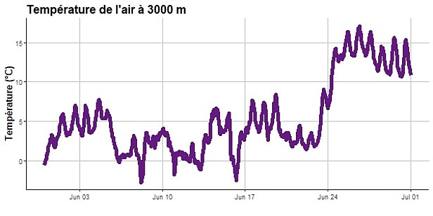 Au début, le mois de juin était très ensoleillé et l’isotherme zéro degré était montée depuis 3300 m jusqu’à 4300 m. Le temps était resté sec jusqu’au dimanche 2 juin. Du lundi 3 juin jusqu’au mercredi 5 juin, davantage de nuages convectifs envahissaient le ciel avec localement des averses et des orages en cours de journée. Cela concernait surtout la partie la plus occidentale du Bas-Valais, les Préalpes et le sud. La limite des chutes de neige se situait à 3000 m. Le vent était faible à modéré de secteur nord à ouest.