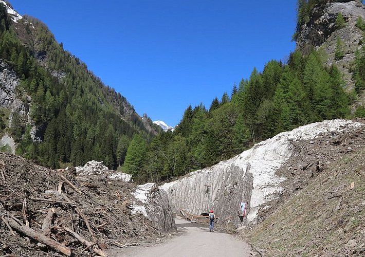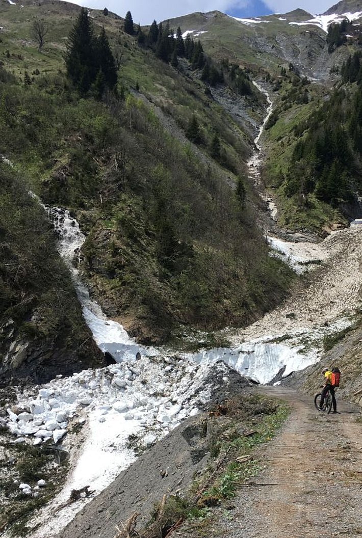 Etant donné qu’il y avait encore énormément de neige, les avalanches de neige mouillée pouvaient atteindre une ampleur dangereuse (cf. photo 2). Le col du Gothard (UR) a été fermé temporairement le 2 juin et le Grand-St-Bernard (VS) le 4 juin à cause d’avalanches. D’autres routes de haute altitude menant vers des cols (p. ex. Susten, Flüela) sont également restées fermées début juin. Certains pâturages et prairies où le bois et les pierres acheminés par les avalanches de l’hiver avaient déjà été évacués étaient à nouveau recouverts de dépôts d’avalanches.