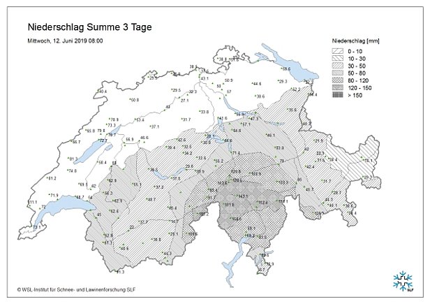 Le dimanche et le lundi de la Pentecôte 9/10 juin, seules les régions de foehn du nord du pays ont encore bénéficié de quelques éclaircies. Ailleurs, le ciel était nuageux avec parfois de fortes averses, surtout sur la crête principale des Alpes du Haut-Valais, dans la région du Gothard et dans le Tessin. La limite des chutes de neige se situait généralement à 3200 m et elle est descendue brièvement à environ 2800 m. Le vent de secteur sud était modéré à fort, mais aussi temporairement tempétueux en altitude et dans les régions généralement touchées par le foehn. Dans cette situation marquée avec des courants de secteur sud, les précipitations se sont davantage étendues vers le nord. Elles étaient temporairement orageuses et très intenses, tout particulièrement pendant la nuit du lundi au mardi 11 juin dans l’ouest et jusque dans l’ouest du Tessin puis, dans la nuit du mardi au mercredi 12 juin depuis l’est du Tessin jusque dans la région de la Bernina en passant par le Misox et le Rheinwald. Depuis le dimanche de la Pentecôte jusqu’au mercredi, il était tombé globalement de 100 à 150 mm de précipitations sur la crête principale des Alpes depuis la région du Simplon jusque dans le val Bregaglia et au sud de ces régions (sans le Sottoceneri) ainsi que dans la région du Gothard. Dans les régions directement avoisinantes au nord, on enregistrait de 60 à 80 mm de précipitations et de 30 à 60 mm sur une grande partie du reste du territoire ainsi que 20 mm en Basse-Engadine (cf. figure 4). Ce n’était qu’au-dessus de 3300 à 3500 m que les précipitations étaient tombées intégralement sous forme de neige.