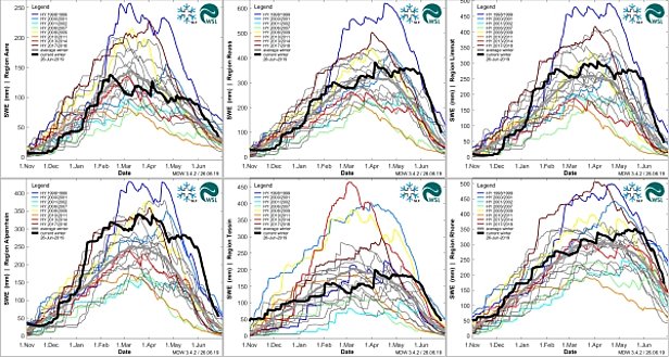 La forte diminution des hauteurs de neige en juin ne concerne pas seulement le Weissfluhjoch, mais aussi l’ensemble des Alpes suisses si l’on se base sur l’évolution de l’équivalent en eau de la neige au niveau régional (cf. figure 7).