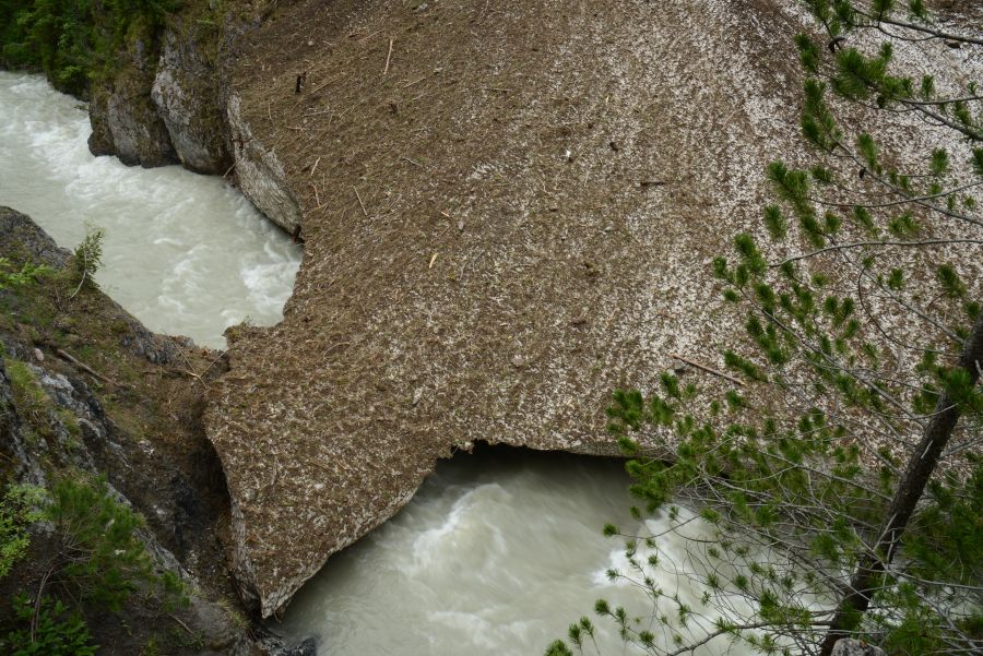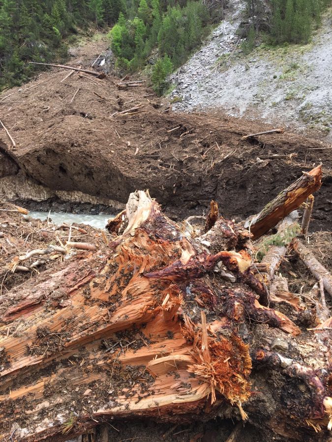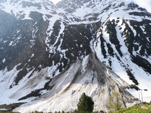 Etant donné qu’il y avait encore énormément de neige, les avalanches de neige mouillée pouvaient atteindre une ampleur dangereuse (cf. photo 2). Le col du Gothard (UR) a été fermé temporairement le 2 juin et le Grand-St-Bernard (VS) le 4 juin à cause d’avalanches. D’autres routes de haute altitude menant vers des cols (p. ex. Susten, Flüela) sont également restées fermées début juin. Certains pâturages et prairies où le bois et les pierres acheminés par les avalanches de l’hiver avaient déjà été évacués étaient à nouveau recouverts de dépôts d’avalanches.