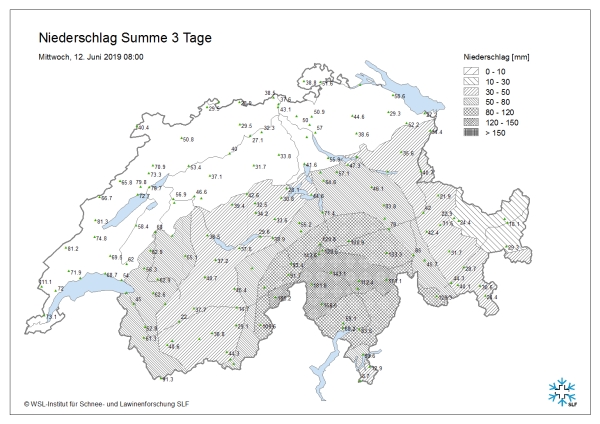Le dimanche et le lundi de la Pentecôte 9/10 juin, seules les régions de foehn du nord du pays ont encore bénéficié de quelques éclaircies. Ailleurs, le ciel était nuageux avec parfois de fortes averses, surtout sur la crête principale des Alpes du Haut-Valais, dans la région du Gothard et dans le Tessin. La limite des chutes de neige se situait généralement à 3200 m et elle est descendue brièvement à environ 2800 m. Le vent de secteur sud était modéré à fort, mais aussi temporairement tempétueux en altitude et dans les régions généralement touchées par le foehn. Dans cette situation marquée avec des courants de secteur sud, les précipitations se sont davantage étendues vers le nord. Elles étaient temporairement orageuses et très intenses, tout particulièrement pendant la nuit du lundi au mardi 11 juin dans l’ouest et jusque dans l’ouest du Tessin puis, dans la nuit du mardi au mercredi 12 juin depuis l’est du Tessin jusque dans la région de la Bernina en passant par le Misox et le Rheinwald. Depuis le dimanche de la Pentecôte jusqu’au mercredi, il était tombé globalement de 100 à 150 mm de précipitations sur la crête principale des Alpes depuis la région du Simplon jusque dans le val Bregaglia et au sud de ces régions (sans le Sottoceneri) ainsi que dans la région du Gothard. Dans les régions directement avoisinantes au nord, on enregistrait de 60 à 80 mm de précipitations et de 30 à 60 mm sur une grande partie du reste du territoire ainsi que 20 mm en Basse-Engadine (cf. figure 4). Ce n’était qu’au-dessus de 3300 à 3500 m que les précipitations étaient tombées intégralement sous forme de neige.
