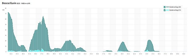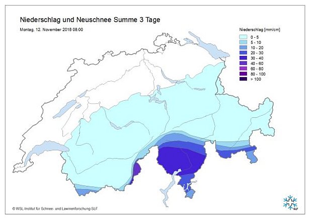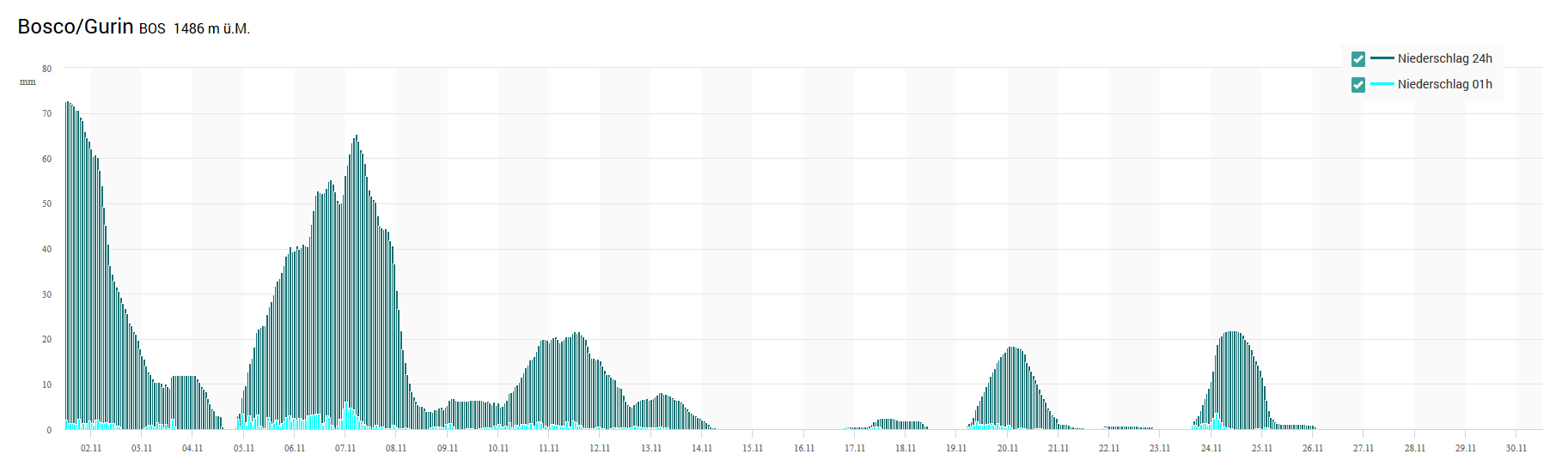 A partir du lundi 5 novembre, il y a eu presque sans interruption plus de huit jours consécutifs de précipitations sur la crête principale des Alpes et au sud de celle-ci, mais l’intensité et les quantités de précipitations étaient nettement plus faibles que lors des fortes chutes de neige de fin octobre (cf. figure 3).