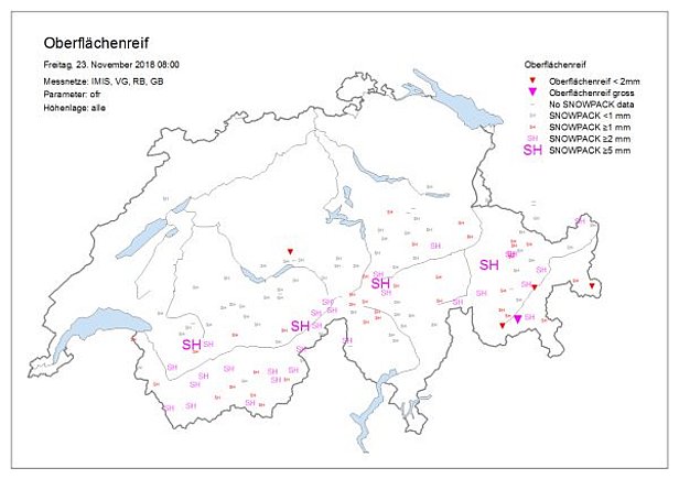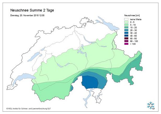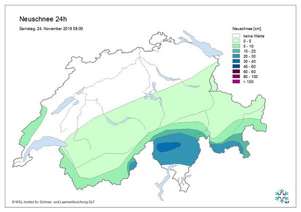 Les 22 et 23 novembre étaient temporairement secs avant que le 23 novembre de nouvelles chutes de neige ne touchent l’ouest et le sud. Elles se sont intensifiées dans la nuit du 23 au 24 novembre apportant à nouveau de 15 à 30 cm de neige sur le versant sud des Alpes et jusqu’à 40 cm dans le centre du Tessin (cf. figure 7).
