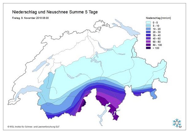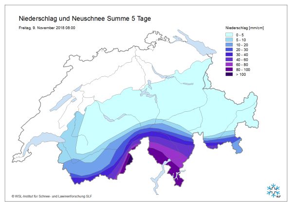 Du lundi 5 au vendredi 9 novembre, les cœur des précipitations était situé sur la crête principale des Alpes du Haut-Valais et dans l’ouest du Tessin. Depuis le Mont Rose jusque dans l’ouest du Tessin en passant par le sud de la région du Simplon, il est tombé quelque 70 à 120 mm de précipitations au-dessus de 2500 m (cf. figure 4). Du 9 au 12 novembre, il est à nouveau tombé de 20 à 40 mm de précipitations sur le centre du versant sud des Alpes et jusqu’à 60 mm dans le sud de la région du Simplon (cf. figure 5). Tout au long de cette période, la limite des chutes de neige était située entre 2000 et 2500 m. Par conséquent, ce n’est vraisemblablement qu’au-dessus de 2500 m que les précipitations étaient intégralement tombées sous forme de neige.