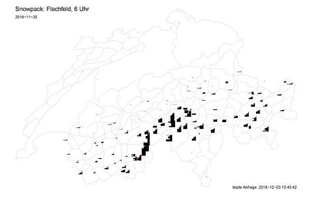 Les fortes chutes de neige de fin octobre sont décrites plus en détail dans le rapport mensuel d’octobre. Jusqu’au jeudi 1er novembre, il a neigé intensément dans le sud. Même si le vendredi 2 novembre les chutes de neige ont diminué, il est néanmoins encore tombé de 20 à 30 cm de neige au-dessus de 2000 m dans l’ouest du Tessin. Ainsi prenait fin l’épisode de fortes chutes de neige qui avait apporté sur le versant sud des Alpes un épais manteau neigeux.