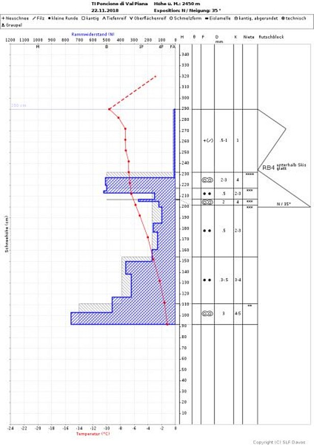 Avec la succession de chutes de neige sur la crête principale des Alpes et au sud de celle-ci, le manteau neigeux y a encore gagné en épaisseur. Comme les températures étaient plus basses, la neige tombée à partir de la mi-novembre était meuble offrant de belles conditions pour les sports de neige avec de la neige poudreuse meuble sur un manteau de neige ancienne dur et bien consolidé (cf. figure 8).