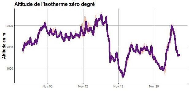 A la fin du mois, il faisait à nouveau brièvement très doux. Le jeudi 29 novembre, les températures à 2000 m ont grimpé, entre autres sous l’influence du foehn, à +7 °C en Valais et sur le versant nord des Alpes et l’isotherme zéro degré est montée à 3000 m (cf. figure 1). Dès le vendredi 30 novembre, le temps s’est à nouveau rafraîchi