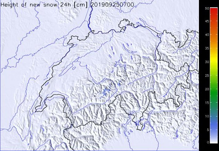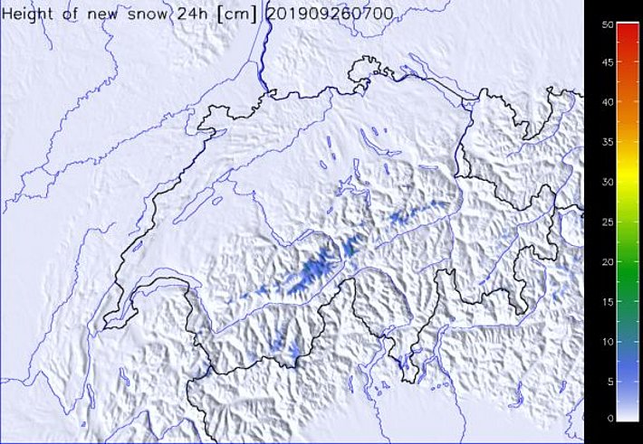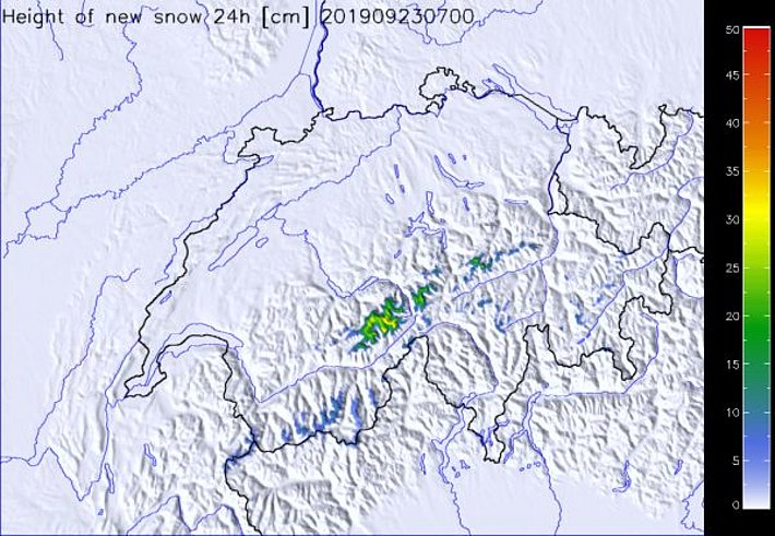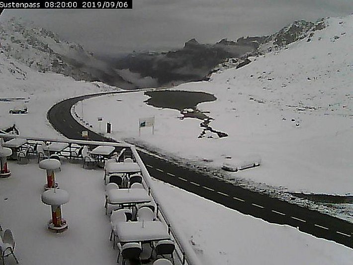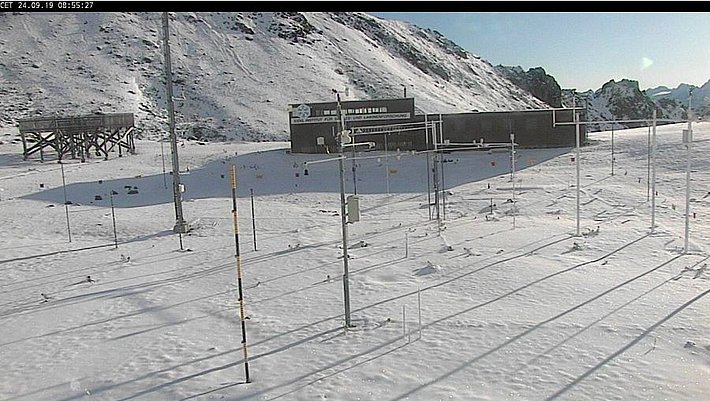 Le samedi 7 septembre, le ciel est resté généralement couvert. Quelque 5 à 15 cm de neige sont tombés en haute montagne sur le centre et l’est du versant nord des Alpes et dans le nord des Grisons, la limite des chutes de neige se situant entre 2000 et 2500 m. De 15 à 30 cm de neige sont ensuite tombés le dimanche 8 septembre au-dessus de 2000 m environ sur la crête nord des Alpes depuis l’Oberland bernois jusque dans les Alpes glaronnaises ainsi que dans les Grisons, et jusqu’à 40 cm en Engadine et dans les régions avoisinantes. La limite des chutes de neige se situait généralement en dessous de 2000 m, mais temporairement nettement plus bas. Un vent de secteur nord temporairement modéré soufflait en altitude.