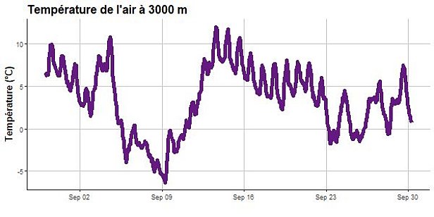 Chaleur – froid – chaleur – froid, en septembre les températures ont joué au yo-yo. Du point de vue nivologique, l’épisode le plus marqué était l’offensive hivernale du vendredi 6 au lundi 9 septembre, lorsqu’il a parfois neigé à partir de 1400 m. Le soleil était le plus généreux vers la mi-septembre, du mardi 10 au lundi 16 septembre, avec une isotherme zéro degré longtemps située au-dessus de 4000 m. A 3000 m, on enregistrait parfois plus de 10 degrés pendant la journée (cf. figure 1). A la fin du mois, il est à nouveau tombé un peu de neige à partir de la limite de la forêt et deux journées automnales ensoleillées ont apporté des conditions plus clémentes.