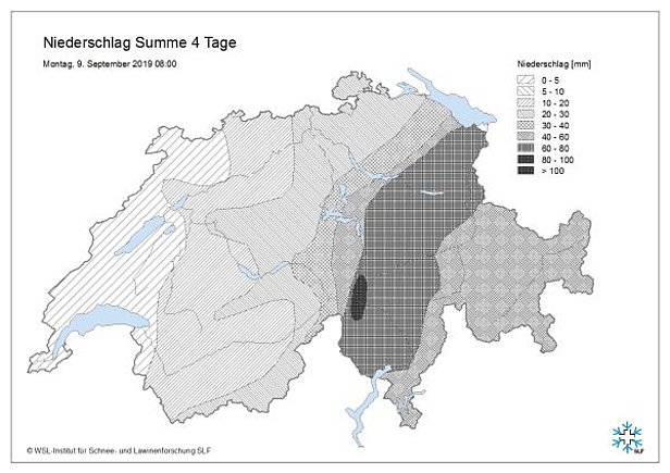 Au total, il est tombé de 60 à 80 cm de neige du 6 au 9 septembre dans une bande allant du Tessin jusque dans les Alpes glaronnaises en direction du Liechtenstein en passant par la région du Gothard, et localement même plus. Dans les Grisons, la somme de neige fraîche était de 40 à 60 cm; vers l’ouest, elle était plus faible (cf. figure 3). Ces quantités de neige étaient atteintes uniquement en haute montagne. A haute altitude (de 2000 à 3000 m), le sol était également blanc, mais les quantités de neige étaient plus faibles.