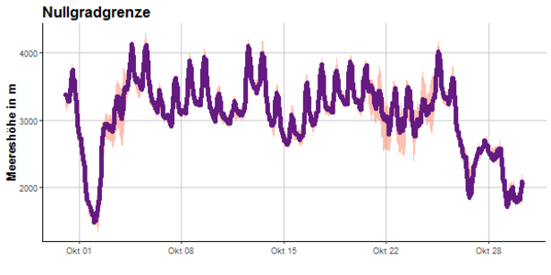 Tout comme les mois précédents, le mois d’octobre était longtemps lui aussi trop sec et trop chaud. Ces conditions météorologiques, qui étaient devenues quasi habituelles, ont cependant cessé vers la fin du mois avec l’arrivée d’une situation persistante de barrage météorologique côté sud avec des courants humides. Elle a apporté non seulement au sud, mais également dans les régions avoisinantes au nord, des quantités de pluie parfois exceptionnelles et beaucoup de neige (cf. série de photos). Pendant cette situation, un bulletin d’avalanches a été diffusé quotidiennement et, à la fin du mois, un fort danger d’avalanche (degré 4) était annoncé dans certaines régions.