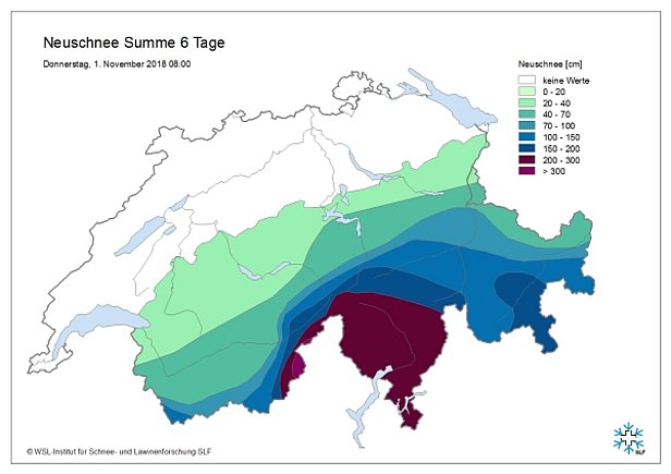 Après une légère accalmie, les précipitations étaient à nouveau très intenses depuis le mercredi 31 octobre midi au jeudi 1er novembre avant midi. Avec une limite des chutes de neige aux alentours de 1500 m, il est tombé de 50 à 90 cm supplémentaires de neige depuis la région du Simplon jusque dans l’ouest du Tessin. Le jeudi matin 1er novembre, les cumuls de neige tombée en six jours indiqués ci-dessus (cf. figure 7) ont ainsi été atteints au-dessus de 2200 m environ. A cette altitude, la neige était parfois humide et, entre-temps, il avait même plu localement. Au-dessus de 2500 à 2800 m, les hauteurs de neige étaient dès lors encore un peu plus importantes.