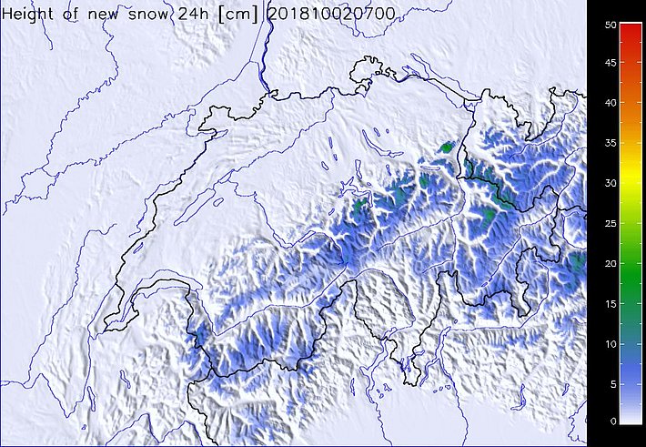 Une classification des quantités de précipitations sous forme de neige en trois jours est difficile à établir, parce que la limite des chutes de neige se situe temporairement au-dessus de 2000 m et que dans les régions concernées il n’y a pas de stations de mesure manuelle à des altitudes aussi élevées. Même pour ce qui concerne les mesures de hauteur de neige fournies par les stations automatiques IMIS, la Haute-Engadine est la région la plus concernée. Des sommes de neige fraîche en trois jours de 170 à 180 cm y ont été mesurées, des valeurs qui ne sont atteintes qu’une fois tous les 10 à 20 ans. Une période de récurrence équivalente s’applique également localement dans la région du Simplon. Ces valeurs sont cependant assez incertaines, parce qu’elles se fondent sur des hauteurs calculées de neige fraîche. Une des raisons pour lesquelles ces valeurs sont inférieures aux valeurs des précipitations liquides pourrait résider dans la densité anormalement élevée de la neige, telle que celle-ci est calculée par le logiciel SNOWPACK de mesure du manteau neigeux. Pour une même masse (kg/m2), on obtient avec une densité élevée une plus faible hauteur de neige fraîche (cm). Une autre raison peut résider dans les erreurs de mesure non identifiées ou dans les avalanches ayant touché les stations par le passé. Celles-ci peuvent avoir pour conséquence qu’aux stations IMIS, de grandes quantités erronées de neige fraîche ont été calculées dans le passé. Des valeurs incorrectes aussi élevées entraînent une sous-évaluation des périodes de récurrence d’un phénomène correctement modélisé.