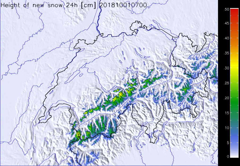 Une classification des quantités de précipitations sous forme de neige en trois jours est difficile à établir, parce que la limite des chutes de neige se situe temporairement au-dessus de 2000 m et que dans les régions concernées il n’y a pas de stations de mesure manuelle à des altitudes aussi élevées. Même pour ce qui concerne les mesures de hauteur de neige fournies par les stations automatiques IMIS, la Haute-Engadine est la région la plus concernée. Des sommes de neige fraîche en trois jours de 170 à 180 cm y ont été mesurées, des valeurs qui ne sont atteintes qu’une fois tous les 10 à 20 ans. Une période de récurrence équivalente s’applique également localement dans la région du Simplon. Ces valeurs sont cependant assez incertaines, parce qu’elles se fondent sur des hauteurs calculées de neige fraîche. Une des raisons pour lesquelles ces valeurs sont inférieures aux valeurs des précipitations liquides pourrait résider dans la densité anormalement élevée de la neige, telle que celle-ci est calculée par le logiciel SNOWPACK de mesure du manteau neigeux. Pour une même masse (kg/m2), on obtient avec une densité élevée une plus faible hauteur de neige fraîche (cm). Une autre raison peut résider dans les erreurs de mesure non identifiées ou dans les avalanches ayant touché les stations par le passé. Celles-ci peuvent avoir pour conséquence qu’aux stations IMIS, de grandes quantités erronées de neige fraîche ont été calculées dans le passé. Des valeurs incorrectes aussi élevées entraînent une sous-évaluation des périodes de récurrence d’un phénomène correctement modélisé.