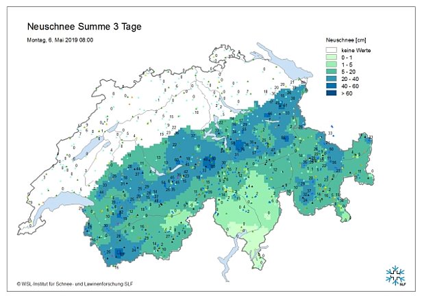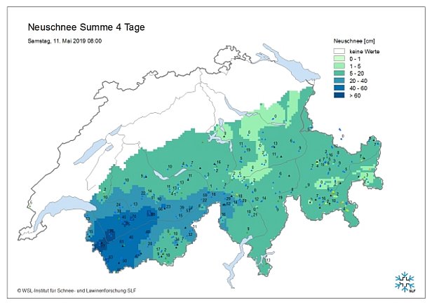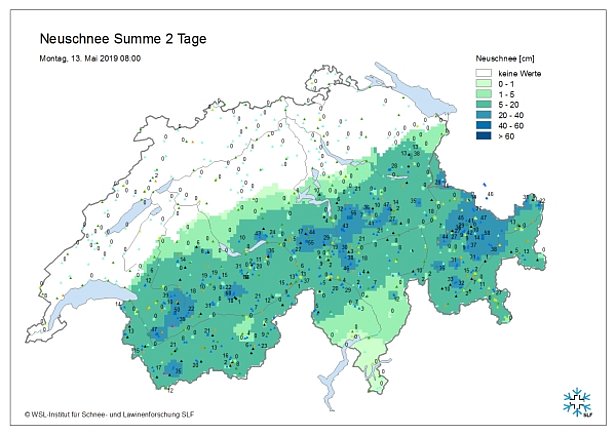 La première moitié du mois de mai était souvent assez froide avec à diverses reprises des chutes de neige jusqu’à moyenne altitude, et temporairement même jusque sur le Plateau central. Les saints de glace ont fait honneur à leurs noms et la fonte totale de la neige s’est fait attendre à haute altitude. C’est ainsi qu’à la mi-mai, à de nombreuses stations de mesure de haute altitude, il y avait encore nettement plus de neige que normalement en cette saison. La succession de chutes de neige et le vent fort ont donné lieu en altitude à des conditions hivernales et temporairement dangereuses pour les randonnées. Il en a résulté plusieurs accidents d’avalanche en zone de randonnées avec une personne tuée.