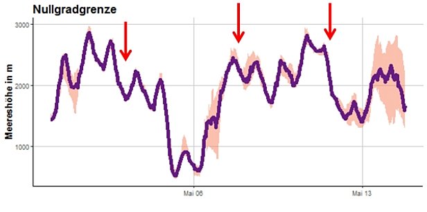 Une succession de chutes de neige d’abord jusqu’à basse altitude, puis jusqu’à moyenne altitude a marqué cette période couverte par le rapport. Pendant la première moitié du mois de mai, le danger d’avalanche résidait davantage dans les avalanches de neige sèche que dans les avalanches printanières de neige mouillée. La figure 1 présente l’évolution de l’isotherme zéro degré. Les flèches rouges marquent les diverses périodes de précipitations et d’avalanches décrites de manière détaillée.