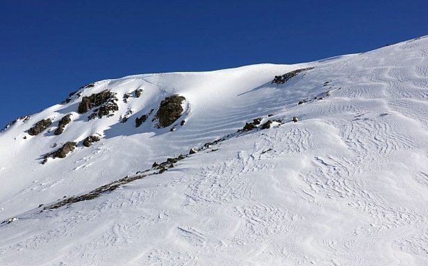 Le vent était généralement modéré à fort, et le dimanche dans le nord fort à tempétueux de secteur nord à nord-est. Il transportait la neige fraîche et parfois aussi la neige encore meuble de la période de précipitations précédente (cf. photo 7). Des accumulations fragiles de neige soufflée se sont formées et, une fois de plus, la neige fraîche et la neige soufflée constituaient le danger principal. De rares bruits sourds et départs d’avalanches étaient signalés au SLF, tout particulièrement en Valais.