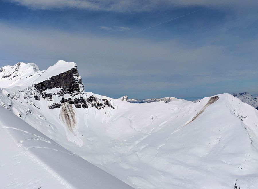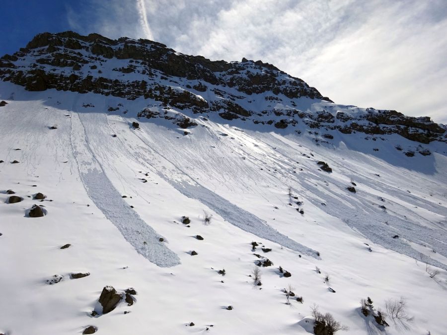 A partir du dimanche, le danger d’avalanche résidait surtout dans les accumulations de neige soufflée généralement petites qui s’étaient formées en altitude et au début également dans les régions du nord touchées par le foehn. Surtout au début de la période analysée, il fallait en outre se méfier de coulées de neige humide et d’avalanches de neige mouillée. En dépit de températures modérées, le manteau neigeux est devenu mouillé sur les pentes exposées au nord jusqu’au-dessus de la limite de la forêt, et souvent jusqu’à plus de 2500 m, la surface s’était légèrement humidifiée. Ces conditions non seulement entravaient le plaisir du ski, mais elles fragilisaient également le manteau neigeux à moyenne altitude. Des coulées de neige humide se sont dès lors produites non seulement à partir de pentes ensoleillées, mais en dessous de 2000 m environ également à partir de pentes exposées au nord (cf. la galerie de photos).
