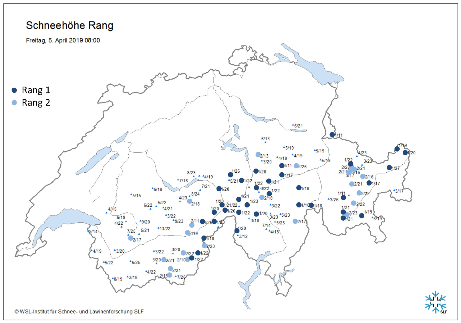 A moyenne altitude, il n’y a normalement plus de grandes quantités de neige vers cette période de l’année. C’est la raison pour laquelle les grandes sommes de neige fraîche de 2 jours étaient suffisantes pour constituer des valeurs maximales pour un 5 avril sur les 3 champs de mesure suivants situés à des altitudes plutôt basses:
