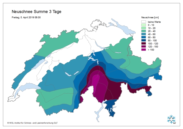 Dès le mardi 2 avril, il y a eu des précipitations dans le sud (cf. le rapport hebdomadaire précédent). Entre mercredi matin et vendredi matin, il a ensuite neigé sur une grande partie du territoire et très intensément dans certaines régions, les chutes de neige les plus abondantes se déplaçant au fil du temps vers l’est depuis la crête principale des Alpes du Haut-Valais jusqu’à la région de la Bernina et dépassant de loin le centre de la crête principale des Alpes vers le nord. La limite des chutes de neige se situait d’abord entre 1600 et 2000 m. Elle est rapidement descendue en dessous de 1000 m dans le nord et entre 1200 et 1600 m dans le sud et l’est. Au début, le vent de secteur sud était fort à tempétueux. Dans le nord, il avait fortement diminué depuis l’ouest déjà pendant les précipitations. Les cumuls suivants de neige sont tombés dans le sud entre mardi matin et vendredi matin, et dans le nord entre mercredi matin et vendredi matin (cf. figure 1):