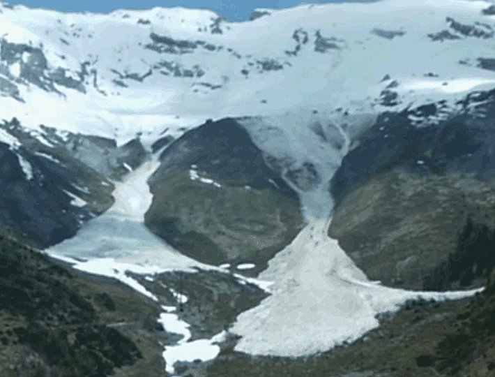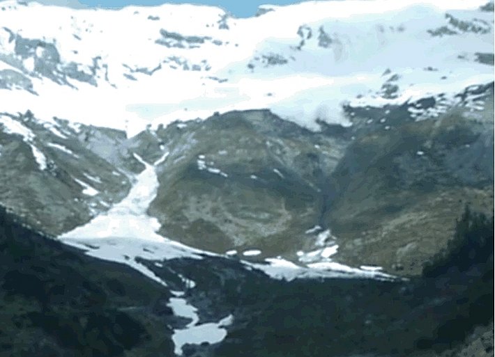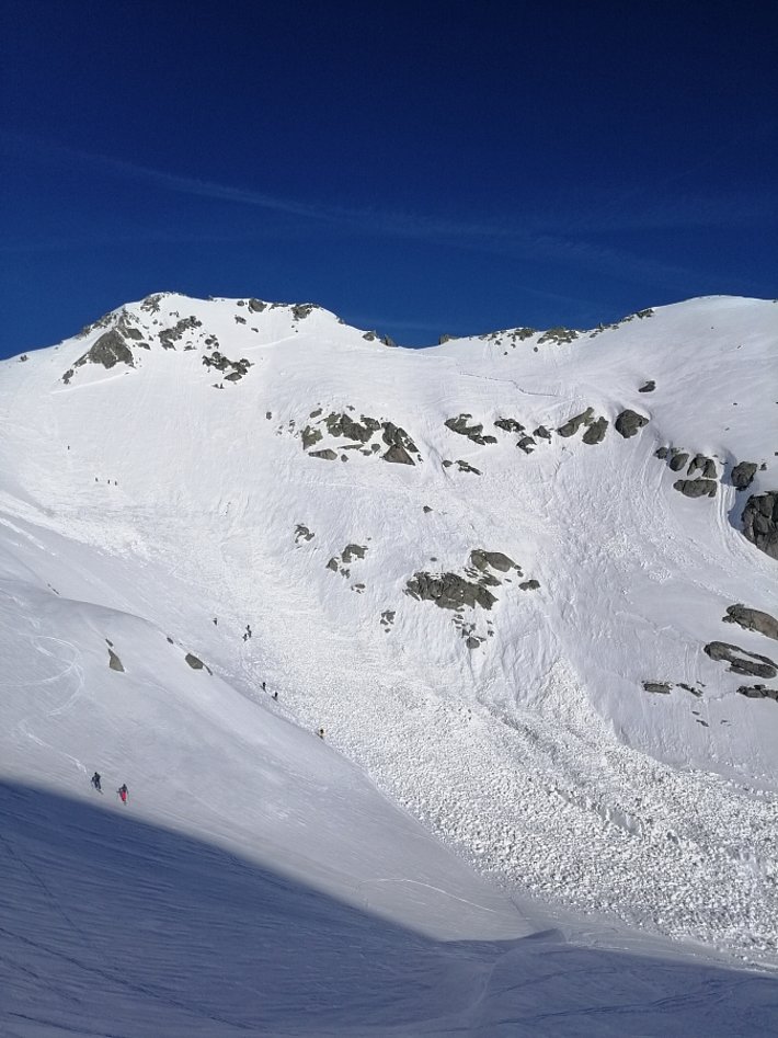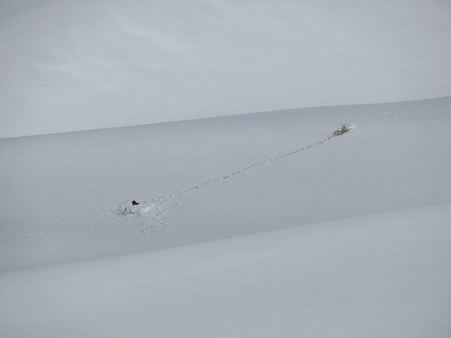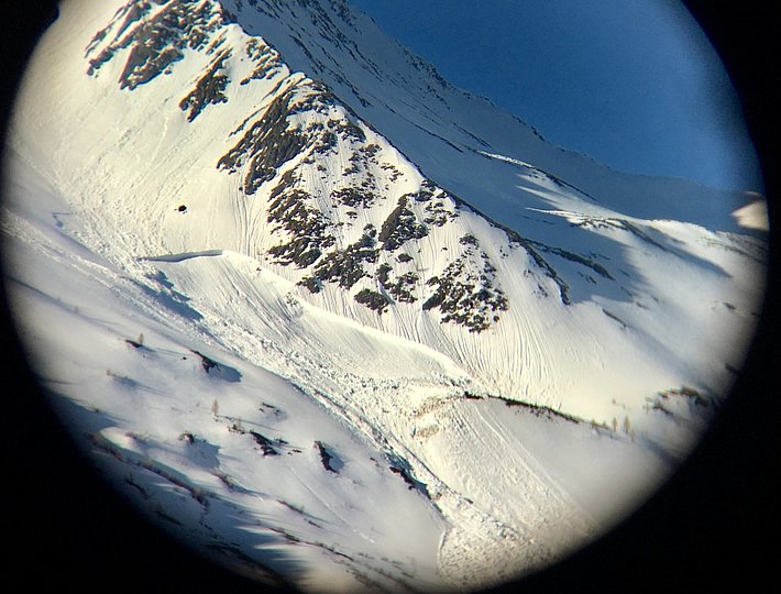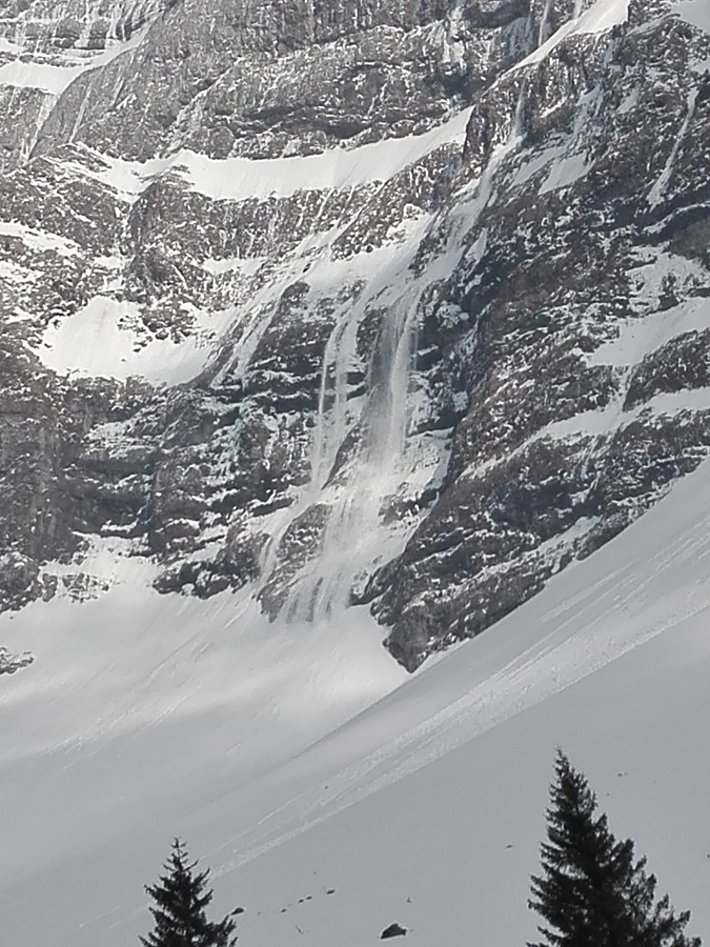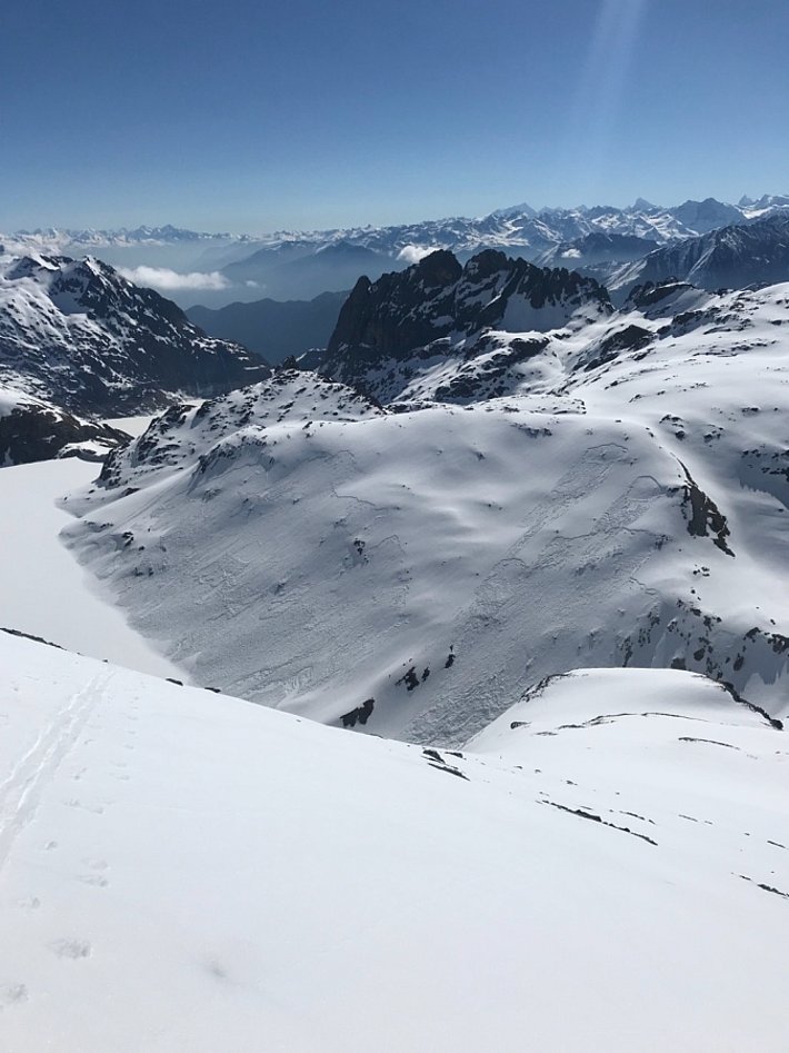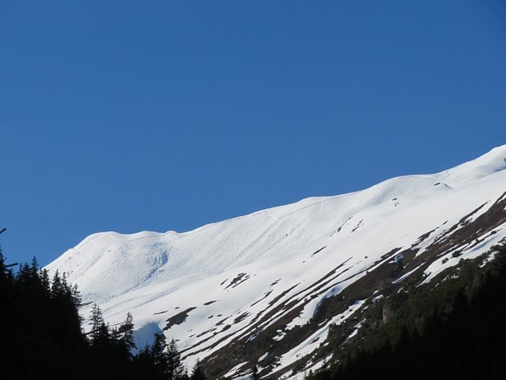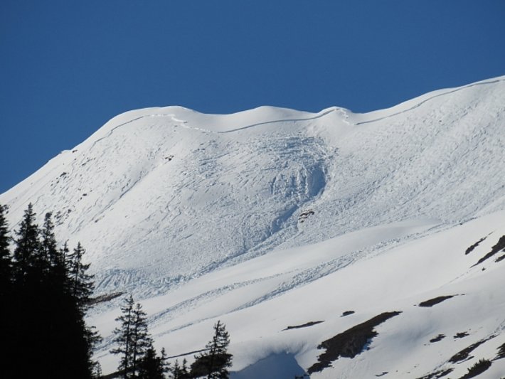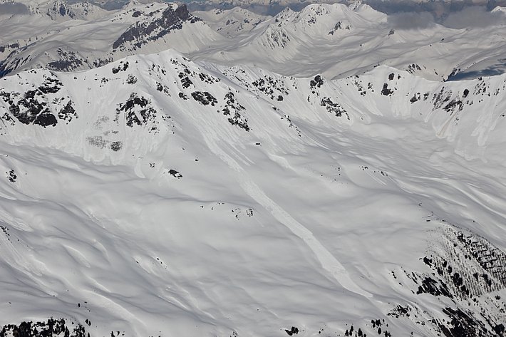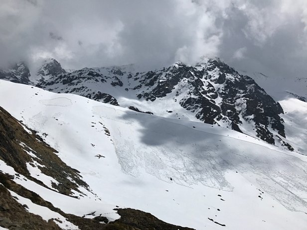 Après des nuits généralement claires, le jeudi et le vendredi 23/24 mai étaient souvent ensoleillés et doux. Le vendredi après-midi, il y a eu des averses locales. L’isotherme zéro degré est montée pour se situer le vendredi à 3400 m dans l’ouest et le sud, et à 3000 m dans l’est. Le vent était faible à modéré de secteur nord-ouest. Des avalanches de neige mouillée se sont déclenchées sous l’effet du réchauffement diurne et de l’ensoleillement. Elles étaient parfois étendues, tout particulièrement sur les pentes orientées au sud et à l’est (cf. photo 4). Mais il y a eu localement aussi de très grandes avalanches, y compris sur les pentes exposées au nord.
