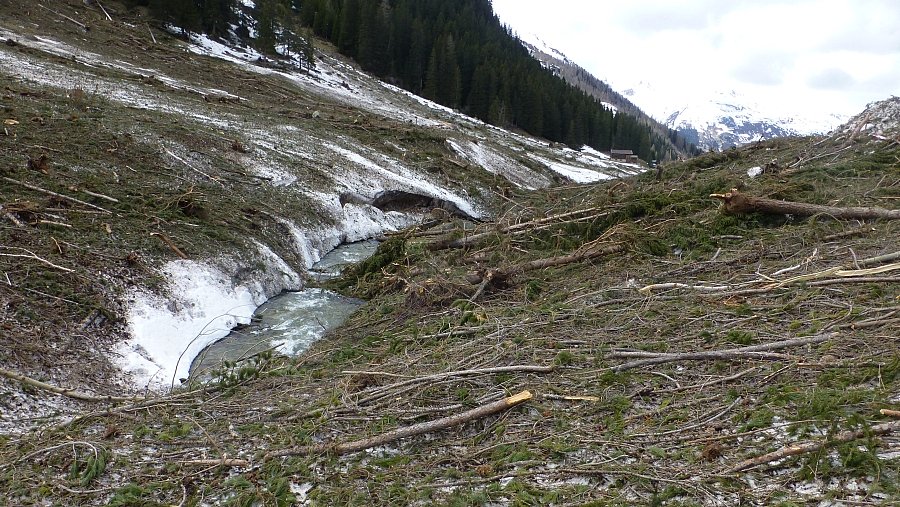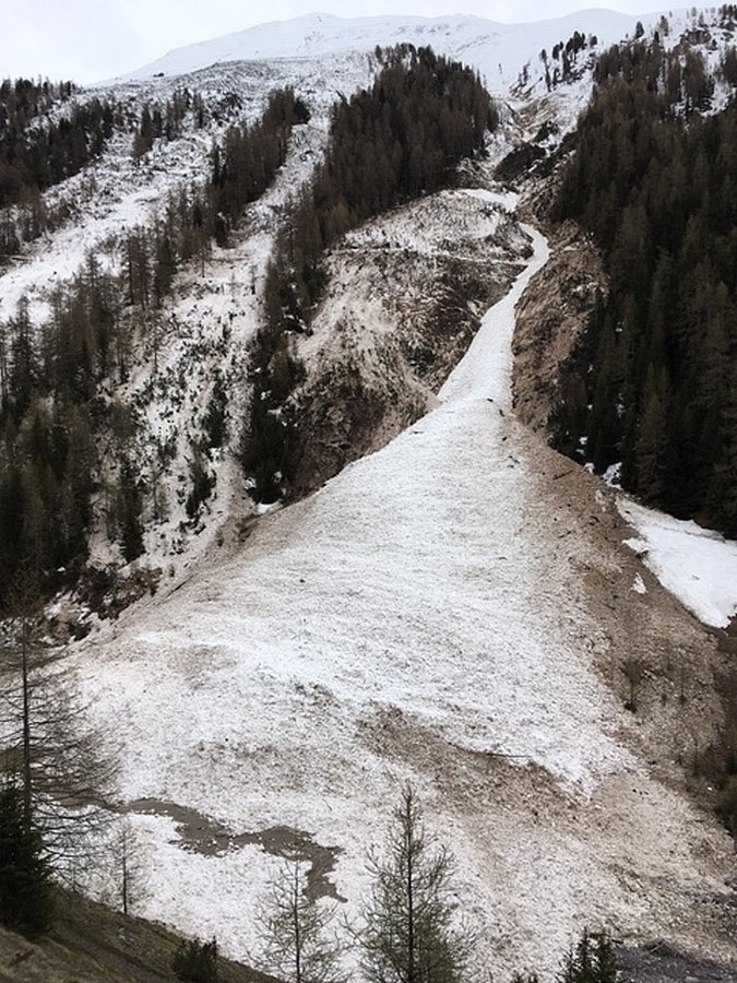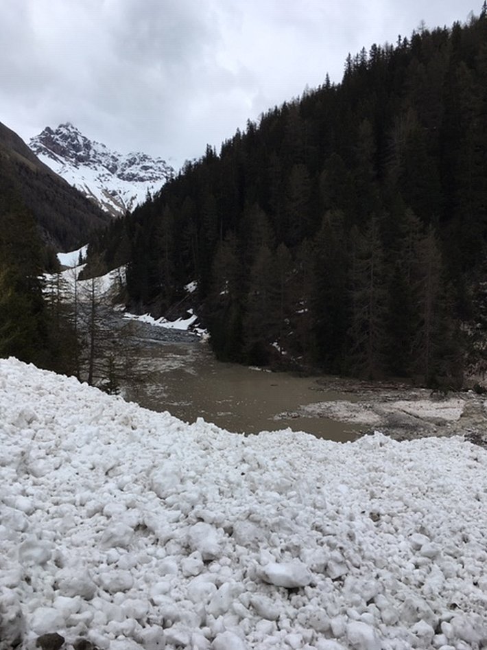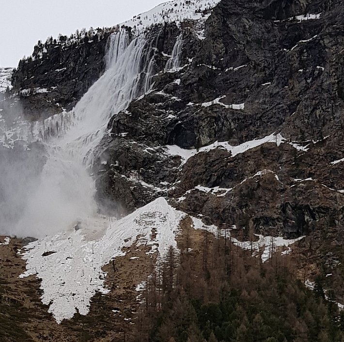 Sous l’effet du réchauffement et de l’ensoleillement, le danger d’avalanche de neige mouillée augmentait à chaque fois rapidement en cours de journée jusqu’au degré de danger 3 („marqué“). En raison de l’abondance de la neige (cf. la section suivante), des avalanches de neige mouillée pouvaient encore atteindre une grande et localement même une très grande ampleur, et menacer les tronçons exposés des voies de communication. Divers cols alpins, mais également des chemins de randonnées et des petites routes restaient fermés en raison du danger d’avalanche (cf. photo 6).