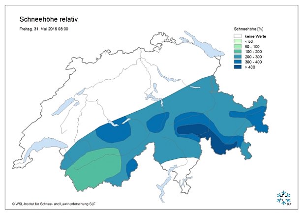A la seule station de haute altitude qui effectue des mesures depuis de nombreuses années, au Weissfluhjoch (2540 m), la hauteur moyenne de neige se situait cette année avec environ 270 cm en deuxième position, derrière les 285 cm enregistrés en 1970 et avant les 258 cm de 1983. Cette année, la hauteur de neige était inhabituelle surtout pendant la seconde moitié du mai avec pour 7 jours des hauteurs de neige encore jamais atteintes.