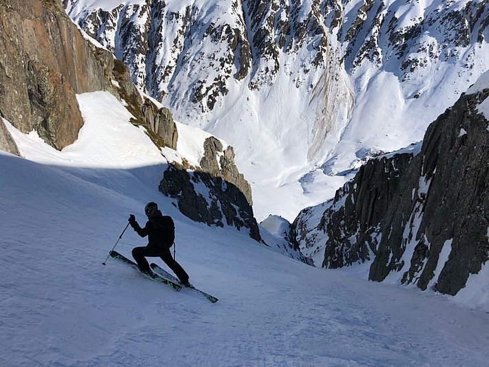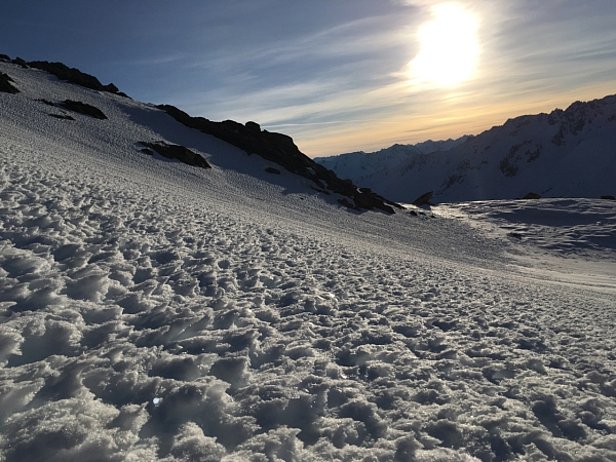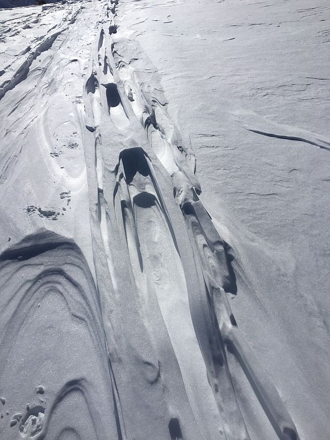 Encore comme en hiver: Sur les pentes exposées au nord, la neige restait sèche. A certains endroits, il y avait parfois encore de la neige meuble métamorphosée permettant une pratique très agréable du ski (cf. photo 3). À d’autres endroits, la surface neigeuse était fortement marquée par l’action du vent et irrégulière. Dans les zones plutôt faiblement enneigées, tout le manteau neigeux avait souvent subi une métamorphose constructive et était meuble, de sorte qu’à pied (mais parfois aussi avec les skis), on s’enfonçait jusque dans des couches proches du sol.