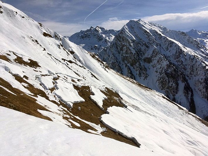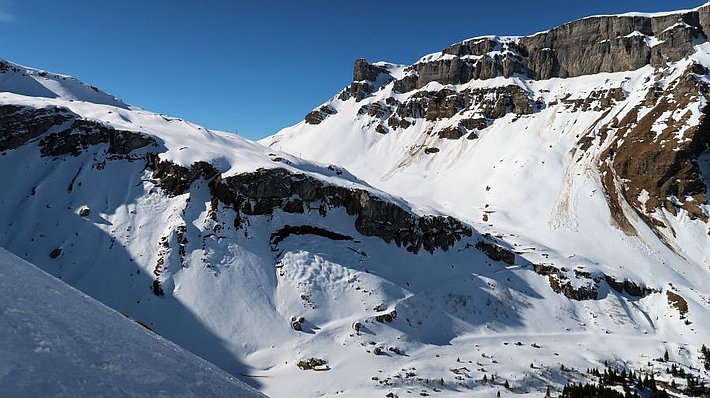 Dès le début de la période examinée, il n’y avait pratiquement plus de neige pouvant être transportée par le vent. Même la neige encore relativement meuble présente sur les pentes exposées au nord (cf. ci-dessus) n’était plus guère transportable par le vent. Par conséquent, le vent fort à tempétueux soufflant surtout le vendredi 22 et le samedi 23 février n’a déplacé que peu de neige (cf. photo 6). Sur les pentes orientées au nord, les accumulations de neige soufflée se sont déposées sur une surface neigeuse défavorable et étaient parfois susceptibles de se décrocher facilement. Elles étaient toutefois seulement minces et les avalanches étaient petites.