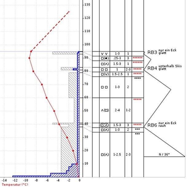 Dans certaines parties des Grisons ainsi que dans les Alpes fribourgeoises et dans l’Oberland bernois directement avoisinant, le problème lié à la neige ancienne jouait au début encore un rôle déterminant justifiant le degré de danger 2 (limité). La partie centrale du manteau neigeux renfermait parfois encore des couches molles de neige métamorphosée à grains anguleux, mais ces couches ne pouvaient plus guère se décrocher. Dans les zones plutôt faiblement enneigées, tout le manteau neigeux était souvent métamorphosé et meuble (cf. figure 7). La propagation d’une rupture était de plus en plus improbable. C’est ainsi que par la suite le danger d’avalanche a pu être ramené au degré 1 (faible) également dans ces régions.