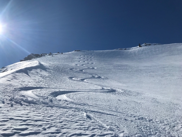 Dès le début de la période examinée, il n’y avait pratiquement plus de neige pouvant être transportée par le vent. Même la neige encore relativement meuble présente sur les pentes exposées au nord (cf. ci-dessus) n’était plus guère transportable par le vent. Par conséquent, le vent fort à tempétueux soufflant surtout le vendredi 22 et le samedi 23 février n’a déplacé que peu de neige (cf. photo 6). Sur les pentes orientées au nord, les accumulations de neige soufflée se sont déposées sur une surface neigeuse défavorable et étaient parfois susceptibles de se décrocher facilement. Elles étaient toutefois seulement minces et les avalanches étaient petites.