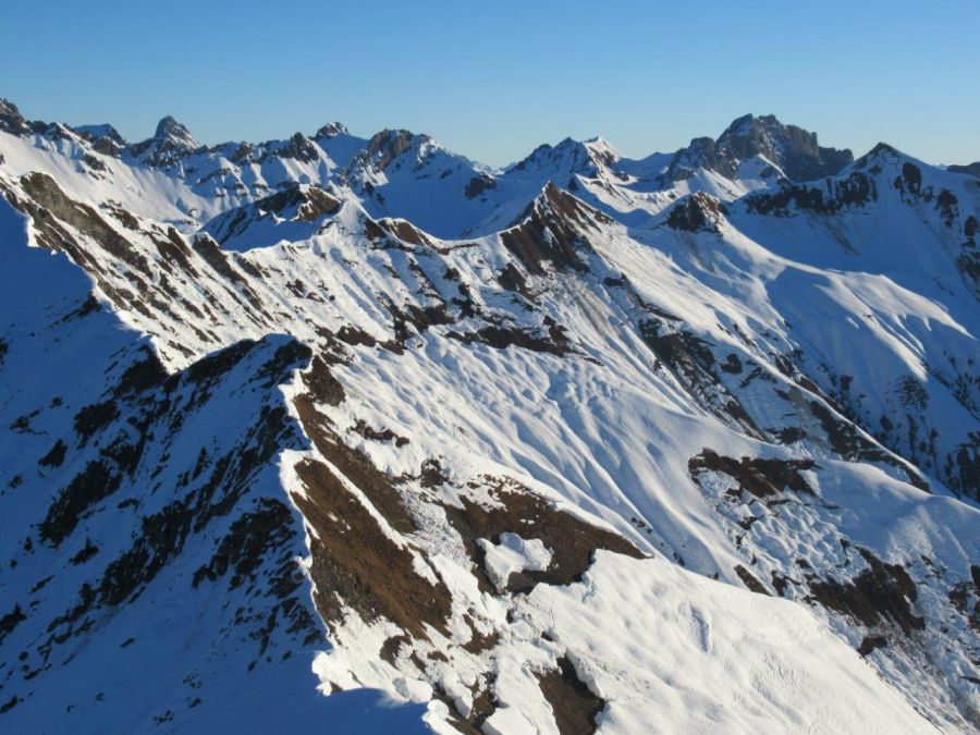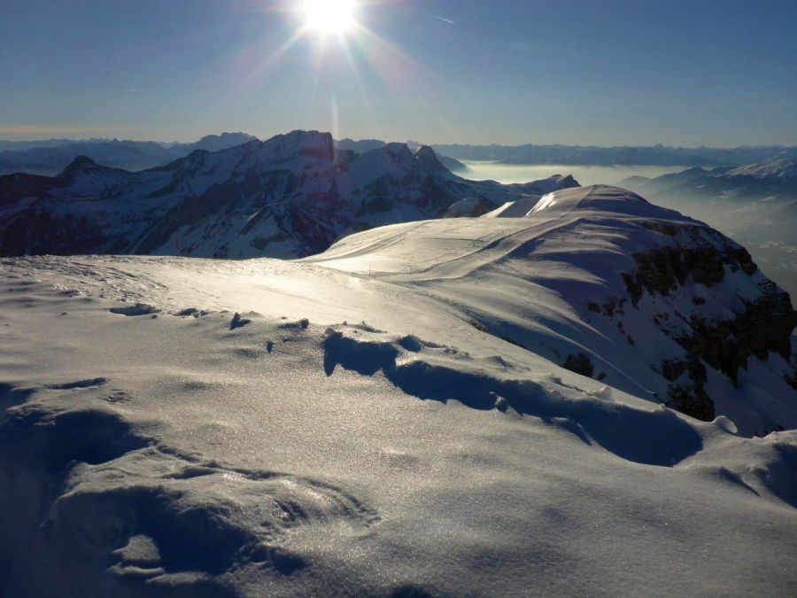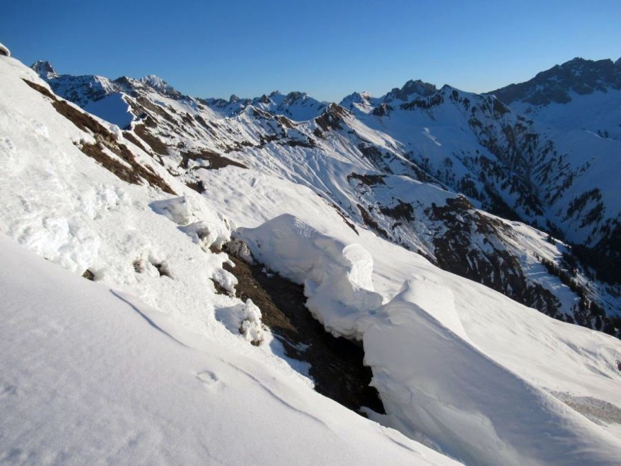 Déjà comme au printemps: Les températures vraiment douces ont surtout eu leur effet sur les pentes raides exposées au sud. Pendant la journée, la neige s’y transformait en neige gros sel sous l’effet de l’ensoleillement. Des pénitents de neige se formaient en de nombreux endroits en raison de la faible humidité de l’air (cf. figure 2). Pendant la nuit, une croûte portante se formait jusqu’en haute montagne.