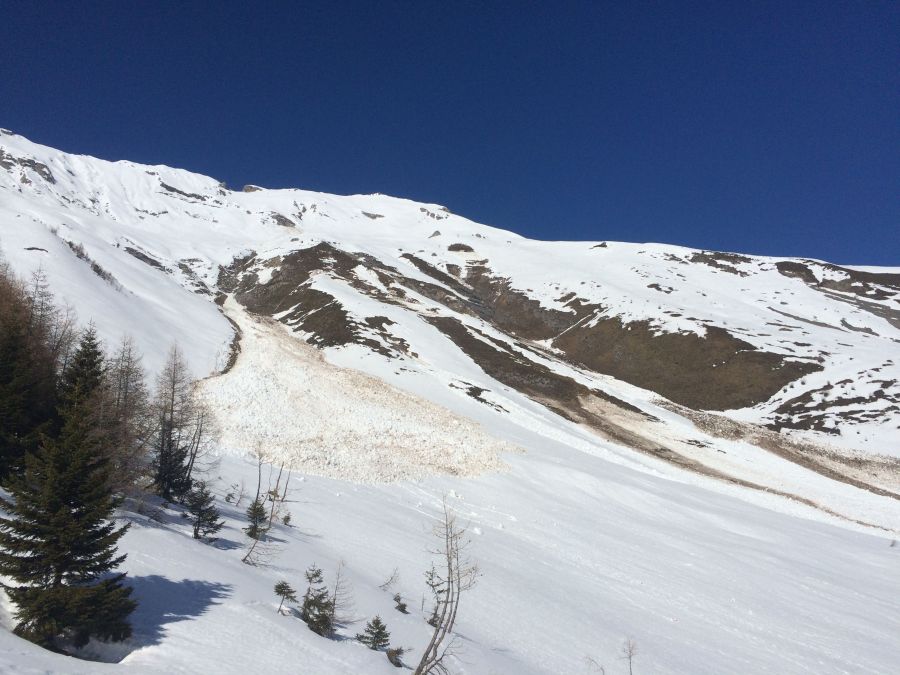 On a observé nettement moins d’avalanches de neige mouillée que d’avalanches de glissement et elles se sont surtout décrochées comme coulées de neige meuble en terrain extrêmement raide percé de rochers. C’est la raison pour laquelle elles ne sont pas reprises comme problème avalancheux dans le bulletin d’avalanches, mais seulement mentionnées dans la description du danger.