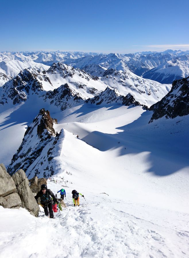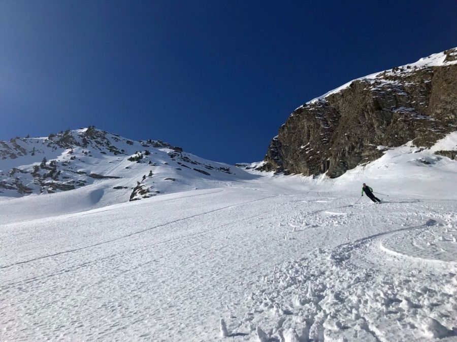 Encore comme en hiver: Sur les pentes exposées au nord, la neige restait sèche. A certains endroits, il y avait parfois encore de la neige meuble métamorphosée permettant une pratique très agréable du ski (cf. photo 3). À d’autres endroits, la surface neigeuse était fortement marquée par l’action du vent et irrégulière. Dans les zones plutôt faiblement enneigées, tout le manteau neigeux avait souvent subi une métamorphose constructive et était meuble, de sorte qu’à pied (mais parfois aussi avec les skis), on s’enfonçait jusque dans des couches proches du sol.
