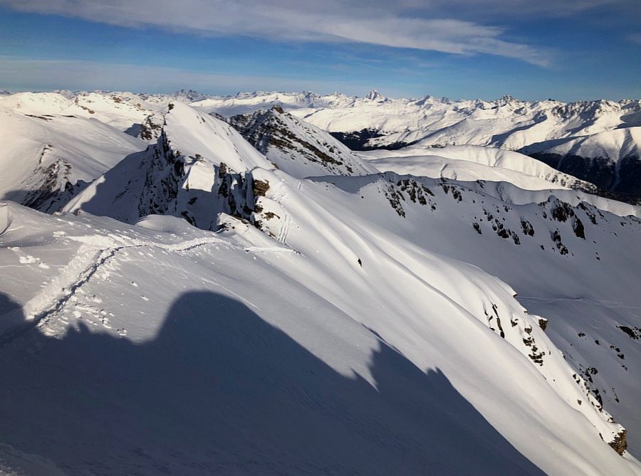 Dans le nord et l’est, le ciel était généralement gris avec de faibles chutes de neige. Globalement, il est tombé de 10 à 20 cm de neige au-dessus de 1600 m sur le versant nord des Alpes, dans le nord des Grisons ainsi que dans le nord de la Basse-Engadine (cf. figure 4). Dans l’ouest, le temps était partiellement ensoleillé et dans l’extrême sud, il était assez ensoleillé. Avec la neige fraîche et le vent modéré à fort de secteur nord, de petites accumulations de neige soufflée se sont formées. Le danger d’avalanche a augmenté un peu dans certaines régions.