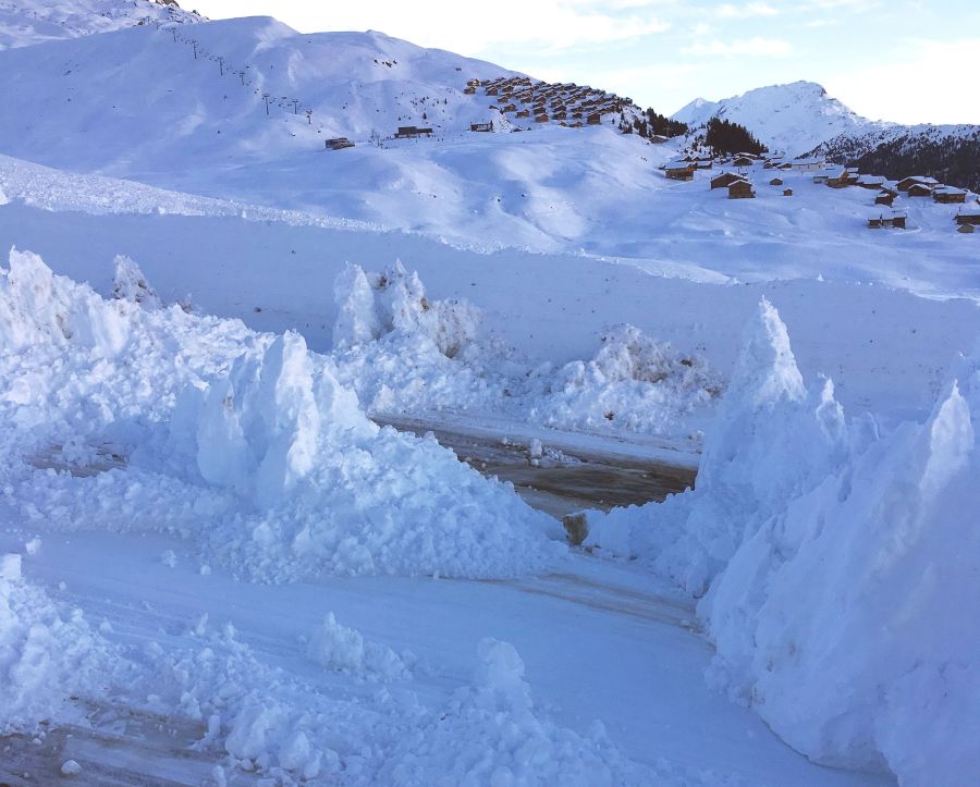 Au nouvel an, les hauteurs de neige entre 1500 et 2000 m étaient inférieures aux valeurs moyennes; elles correspondaient plus ou moins à ces valeurs uniquement dans l’est des Grisons. En dessous de 1500 m, il n’y avait que très peu voire pas du tout de neige en de nombreux endroits (cf. photo 6). A haute altitude, c’est-à-dire au-dessus de 2000 m, les hauteurs de neige étaient presque partout quasi équivalentes à légèrement supérieures aux valeurs moyennes de cette période de l’année. Plus particulièrement dans l’est des Grisons, comme par exemple au-dessus de Samnaun, cinq stations de mesure automatiques n’avaient encore jamais enregistré autant de neige que cette année pour un 3 janvier (nombre d’années de relevés entre 16 et 21 ans). La situation était similaire dans la région du Simplon - Saas-Fee. Ici aussi, trois stations situées au-dessus de 2000 m atteignaient des maxima de hauteur de neige pour cette date. Ceci était toutefois imputable aux énormes chutes de neige de novembre plutôt qu’aux précipitations actuelles.