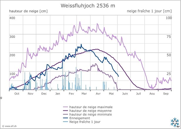 A haute altitude, les hauteurs de neige ont rapidement diminué au cours de la seconde moitié du mois de mai. Ceci est démontré, par exemple, par l’évolution des hauteurs de neige à la station de mesure manuelle du Weissfluhjoch (Davos, GR, 2540 m). Sur ce champ horizontal (abrité du vent), il y avait encore 85 cm de neige le 31 mai (courbe bleue dans la figure 10). Cela ne correspond exactement qu’à 58 % de la hauteur moyenne de neige en cette période de l’année (courbe violette épaisse). Alors que jusqu’en mars les hauteurs de neige en altitude correspondaient plus ou moins aux données moyennes pluriannuelles, elles ont chuté jusqu’à des valeurs nettement inférieures aux hauteurs de neige moyennes pendant le mois d’avril sec et doux. Des informations complémentaires sur l’évolution de l’hiver sont fournies par le rapport de l’hiver.