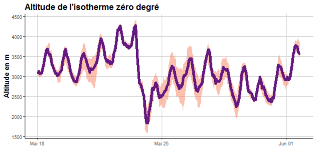 Par la suite, le temps était généralement ensoleillé jusqu’après l’Ascension avec formation de nuages convectifs en cours de journée. Les températures n’ont cessé d‘augmenter et l’isotherme zéro degré dépassait la barre des 4000 m le 20 mai (cf. figure 7). Avec le beau temps et l’assouplissement des mesures liées au coronavirus, il y avait à nouveau davantage de randonneurs en montagne, ce qui a permis au SLF d’obtenir un peu plus d’informations de terrain (cf. photo 4).