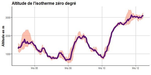 Le lundi matin a donné lieu à de nouvelles chutes de neige. La limite des chutes de neige se situait d’abord aux alentours de 1000 m. Pendant la journée, il y a eu quelques éclaircies dans l’ouest et le sud, alors que les averses de neige persistaient ailleurs. Après une brève pause au cours de la nuit du lundi au mardi, la neige s’est à nouveau mise à tomber. Le mardi matin, la limite des chutes de neige se situait encore à 800 m, mais dans le courant de la journée, elle est montée à 2400 m dans le nord. Des traces de pluie ont même été observées localement à 2700 m. Dans les régions intra-alpines, la limite des chutes de neige était restée plus longtemps à basse altitude pour ne monter qu’en toute fin de journée à environ 2000 m. Parallèlement à la limite des chutes de neige, l’isotherme zéro degré n’a cessé de jouer au yo-yo (cf. figure 5).