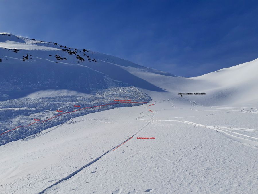 Alors que le problème lié à la neige soufflée perdait de son acuité, à partir du vendredi il y avait à nouveau des signalements d'avalanches, parfois de grande ampleur, qui se décrochaient dans la neige ancienne. Comme typiquement pour les avalanches de neige ancienne, les endroits dangereux n'étaient guère reconnaissables, pas très nombreux, mais avec une étendue dangereuse. Une fois de plus, il apparaissait de manière impressionnante que les avalanches de neige ancienne peuvent être très dangereuses. Heureusement, personne n'a été grièvement blessé (cf. figure 2 et photo 3).