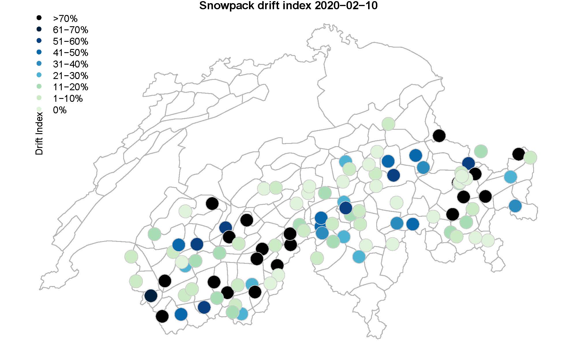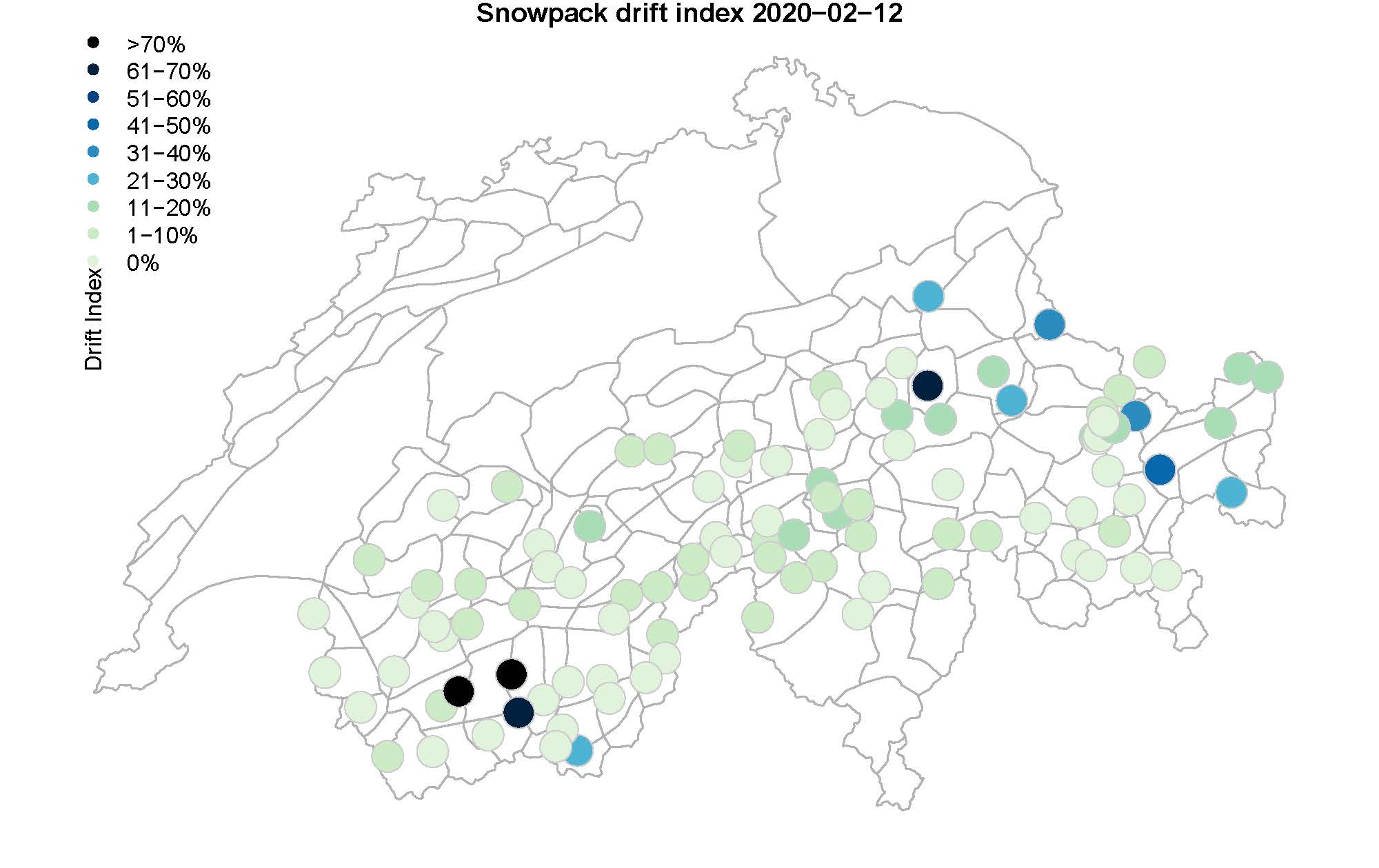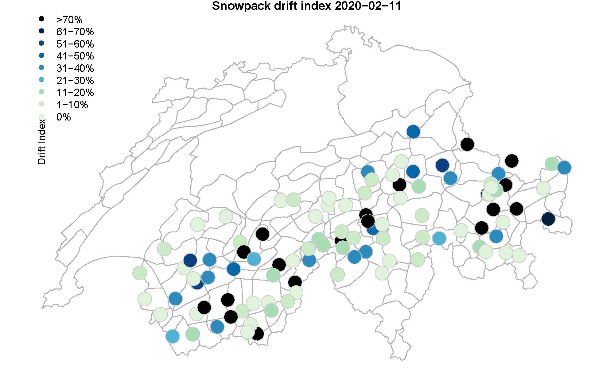 Pendant la nuit du dimanche au lundi 10 février, la dépression cyclonale «Sabine» a atteint les Alpes. L'élément prédominant des lundi 10 et mardi 11 février était le vent qui soufflait souvent en tempête, surtout dans l'ouest et le nord, transportant à la fois la neige fraîche et la neige ancienne (cf. figure 6). Le Tessin était épargné par les vents les plus forts; le vent de secteur ouest y était temporairement modéré.