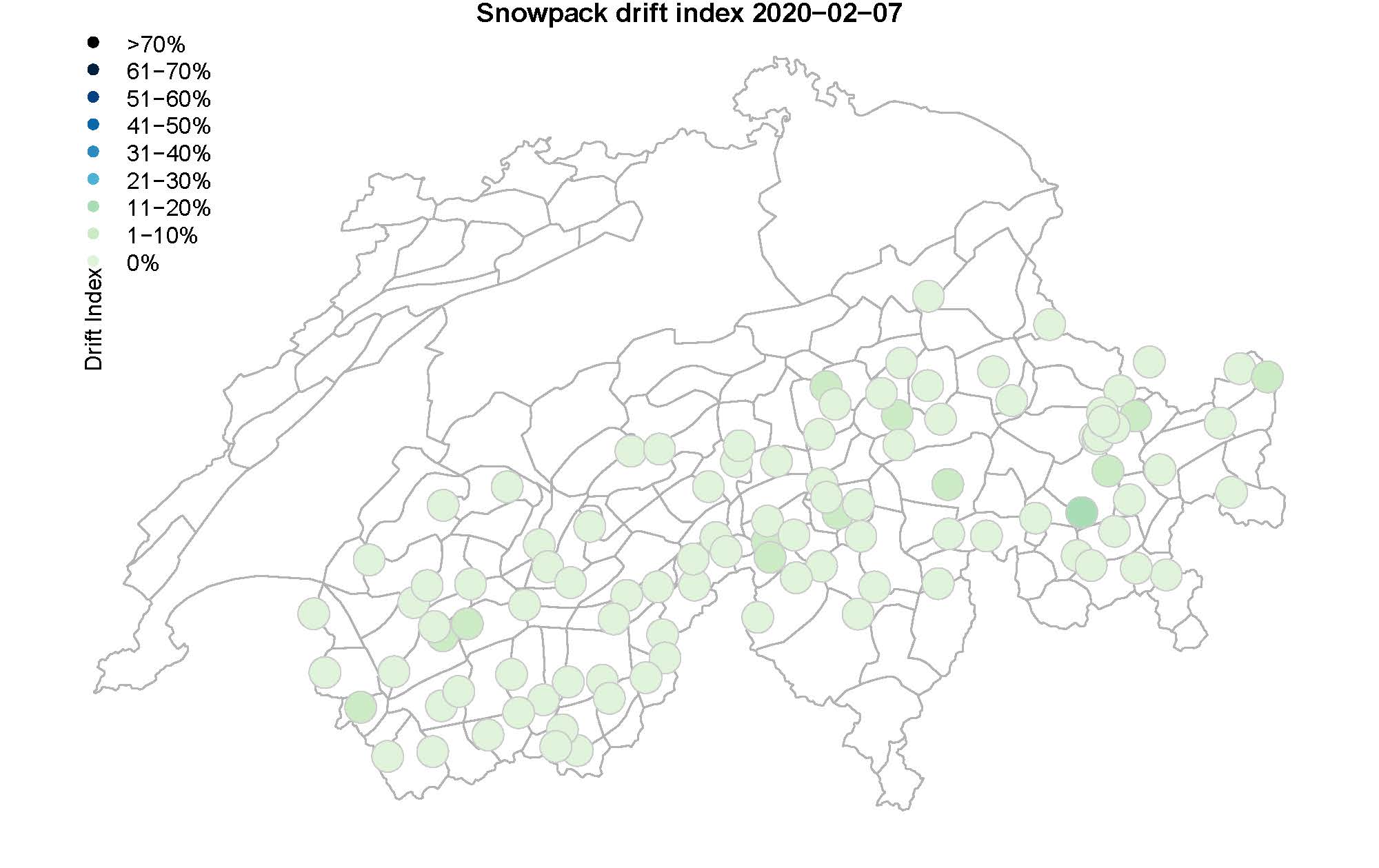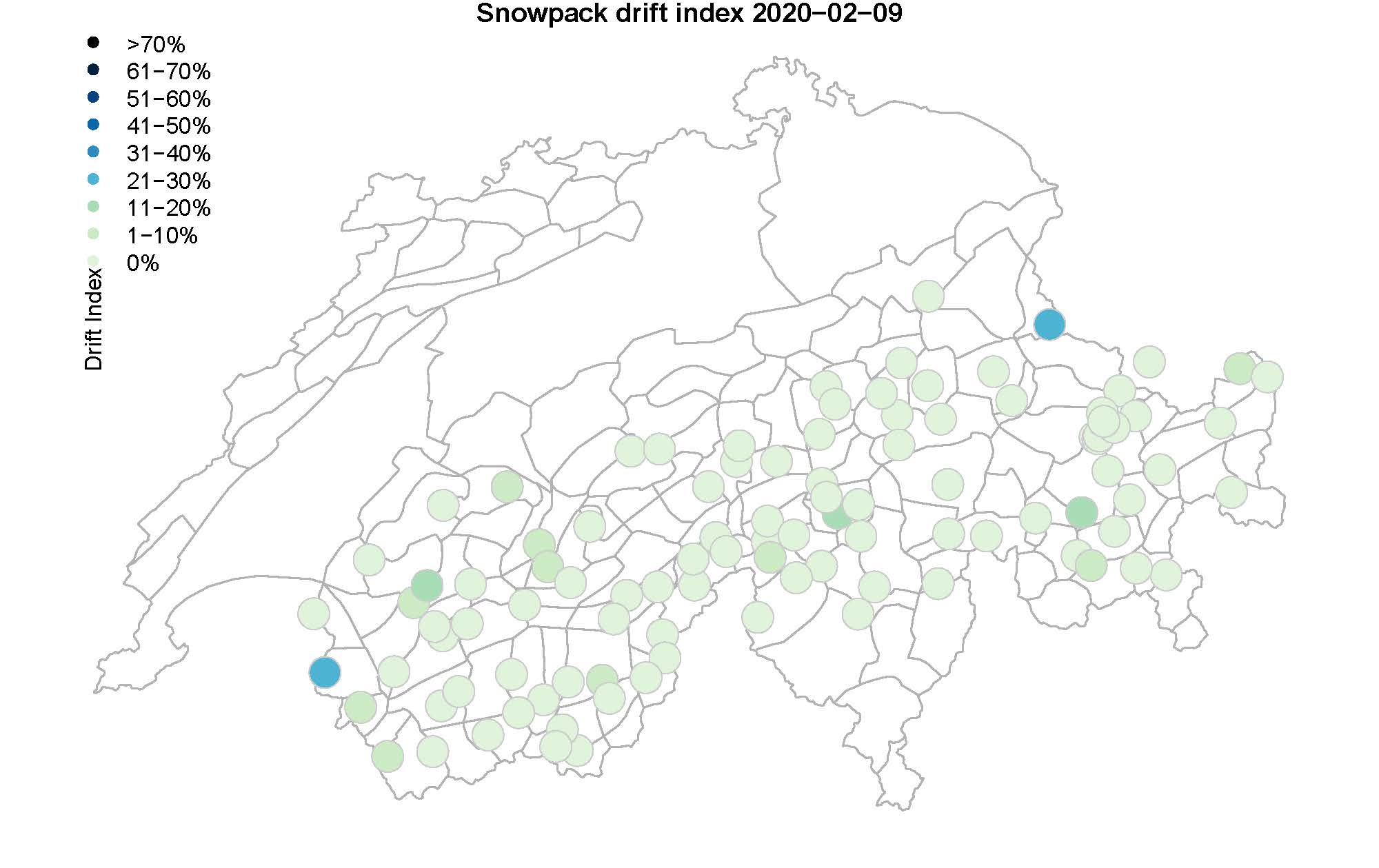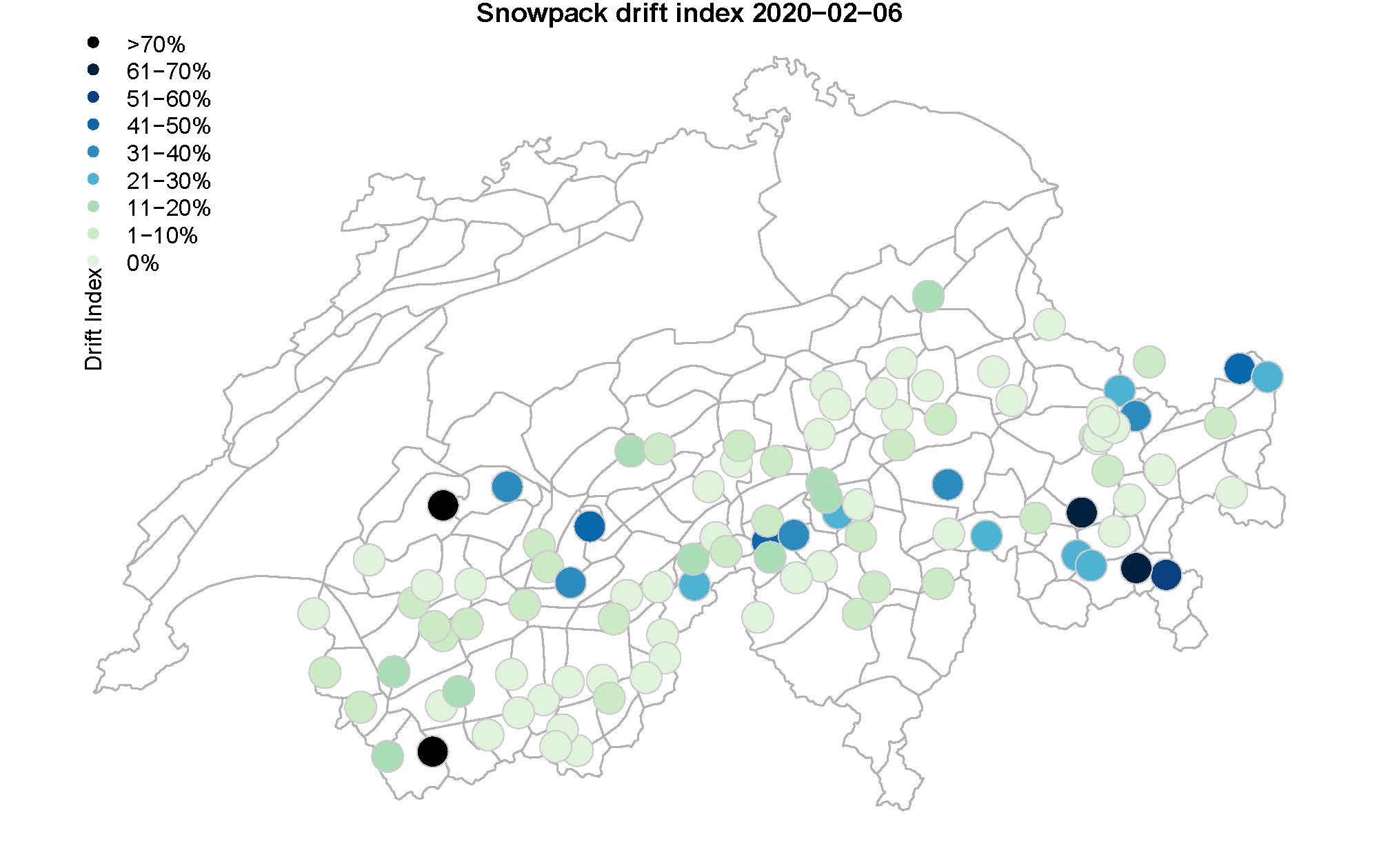Pendant la nuit du dimanche au lundi 10 février, la dépression cyclonale «Sabine» a atteint les Alpes. L'élément prédominant des lundi 10 et mardi 11 février était le vent qui soufflait souvent en tempête, surtout dans l'ouest et le nord, transportant à la fois la neige fraîche et la neige ancienne (cf. figure 6). Le Tessin était épargné par les vents les plus forts; le vent de secteur ouest y était temporairement modéré.