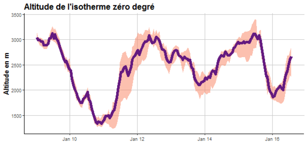 A 2000 m, le vendredi 10 janvier était une journée hivernale avec une température de -2 à -4 °C. Par la suite, les températures sont rapidement devenues positives. L’isotherme zéro degré se situait temporairement à 3000 m (cf. figure 1).