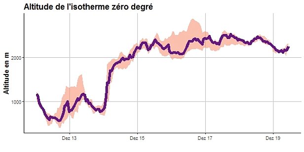 Par ailleurs, il a neigé abondamment surtout dans l’ouest et le sud (cf. figures 4, 10). Les températures étaient très douces pour la saison, surtout dans le nord. L’isotherme zéro degré a grimpé depuis en dessous de 1000 m au début de la période examinée à plus de 2000 m à partir du dimanche 15 décembre.