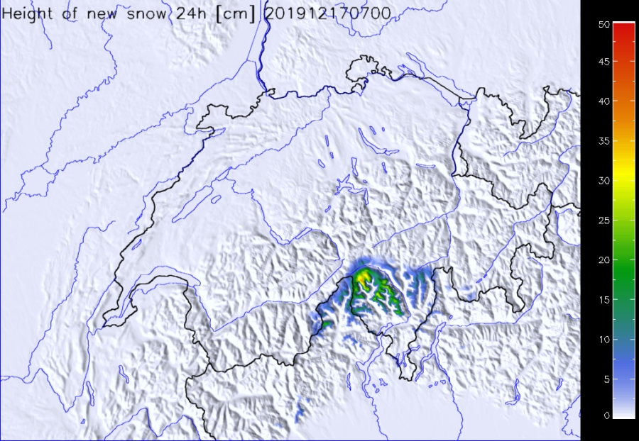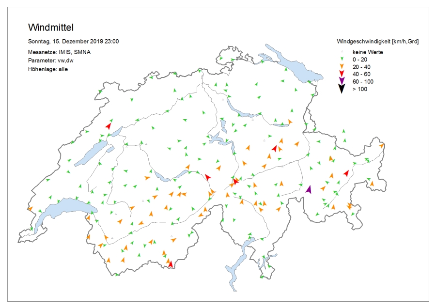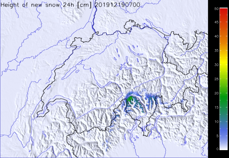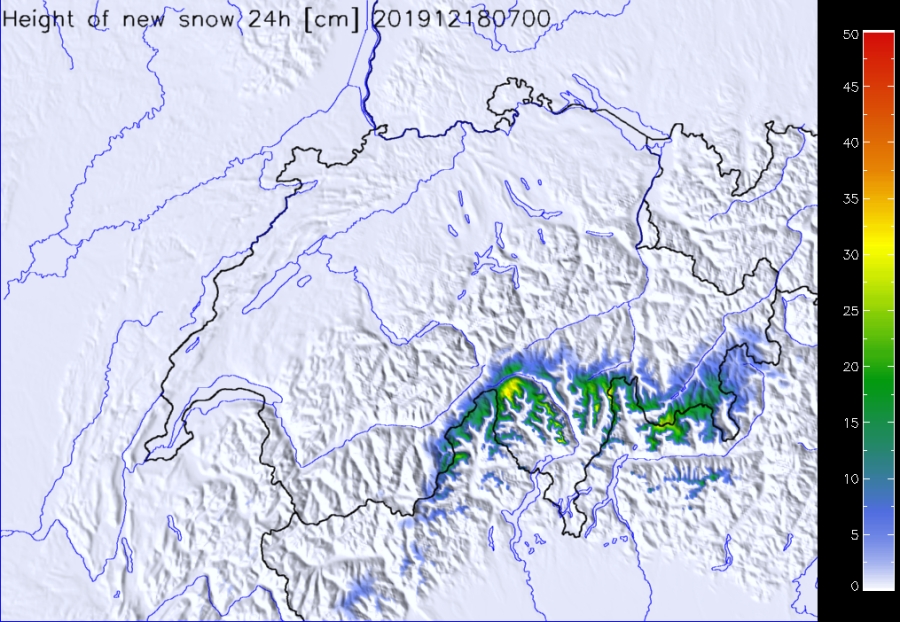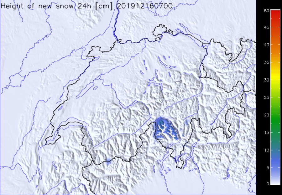 Par ailleurs, il a neigé abondamment surtout dans l’ouest et le sud (cf. figures 4, 10). Les températures étaient très douces pour la saison, surtout dans le nord. L’isotherme zéro degré a grimpé depuis en dessous de 1000 m au début de la période examinée à plus de 2000 m à partir du dimanche 15 décembre.