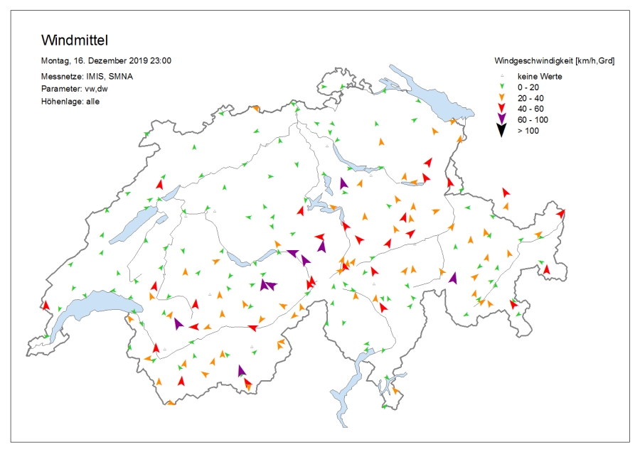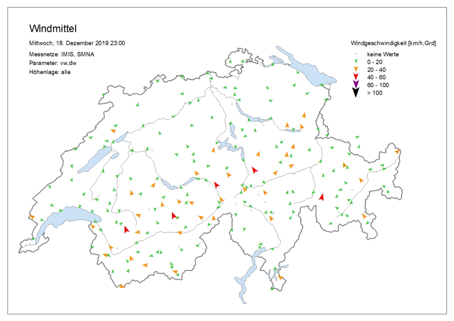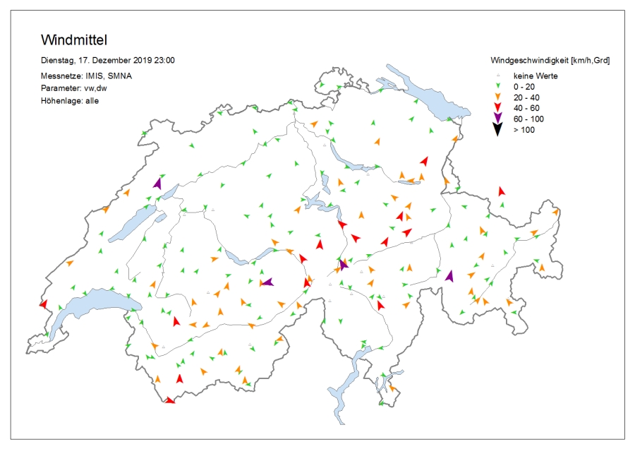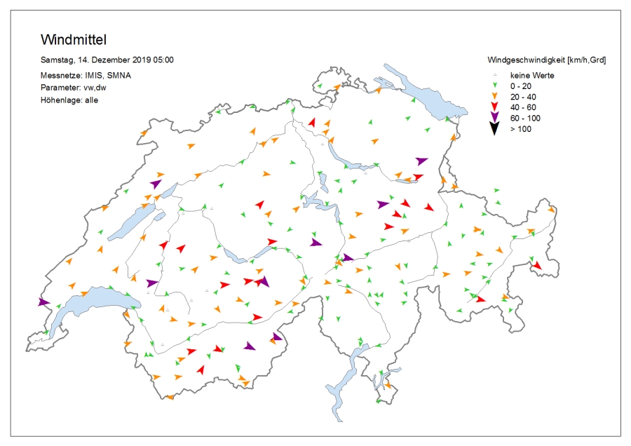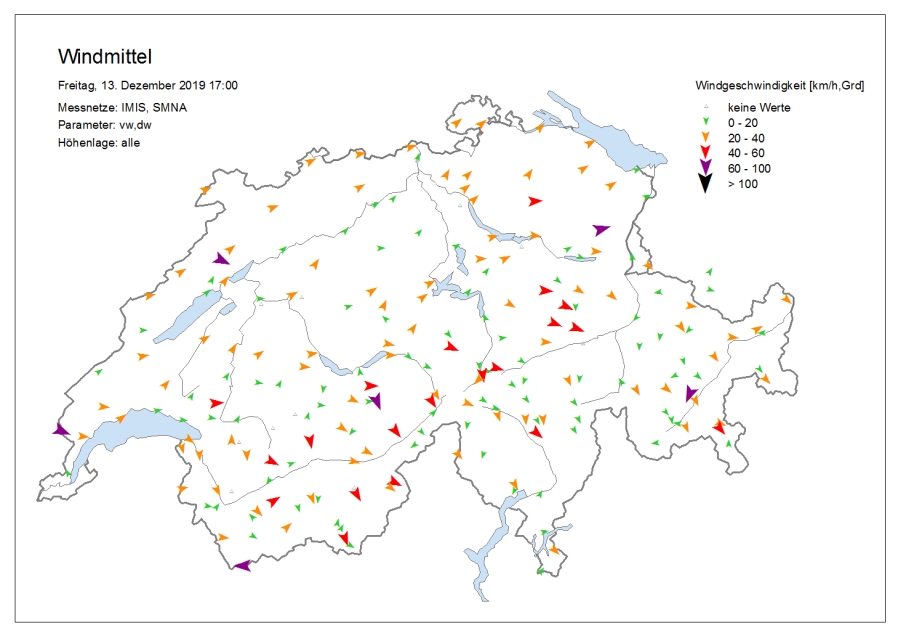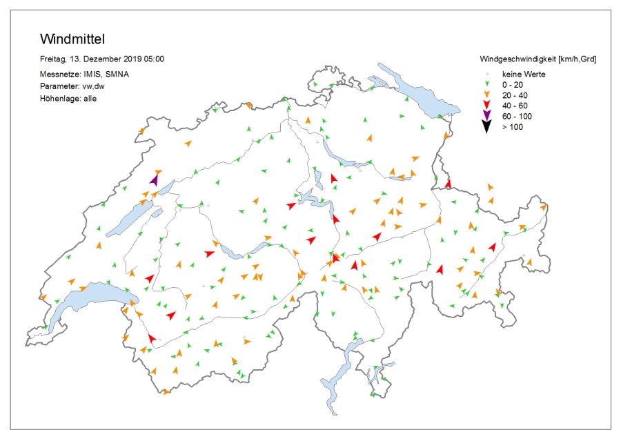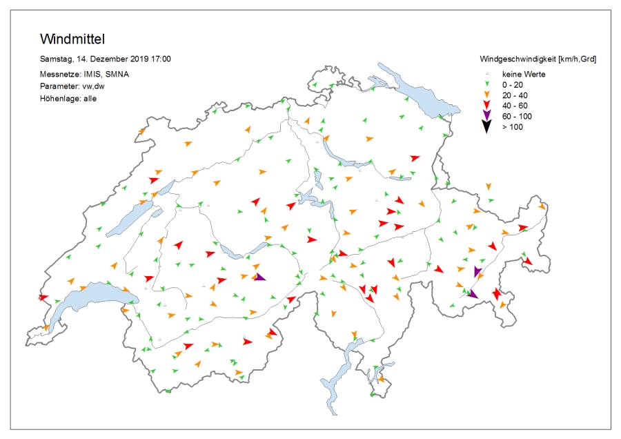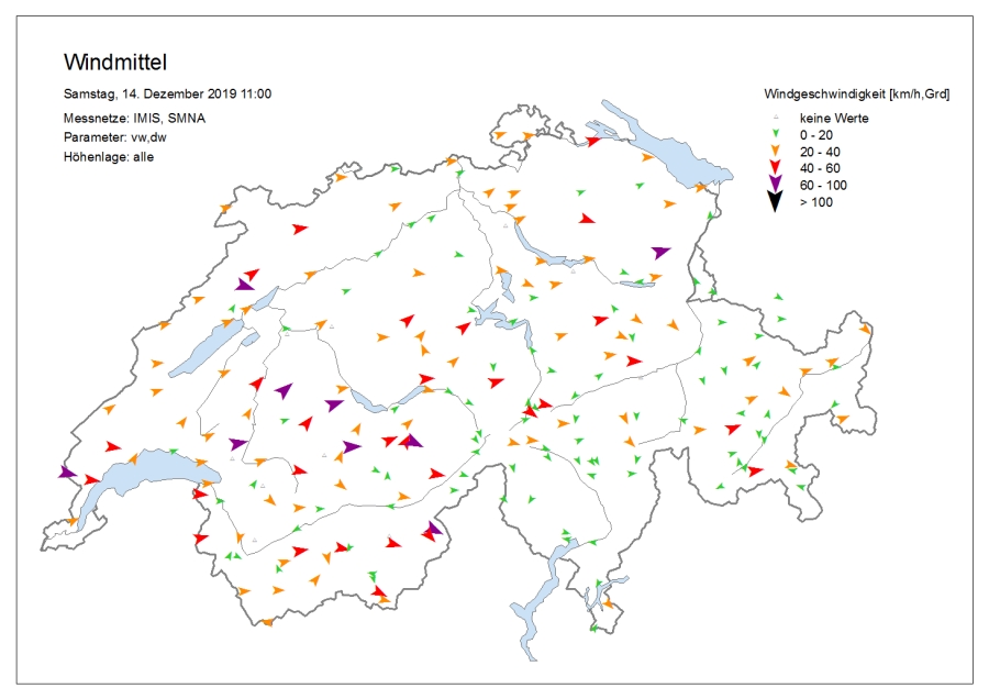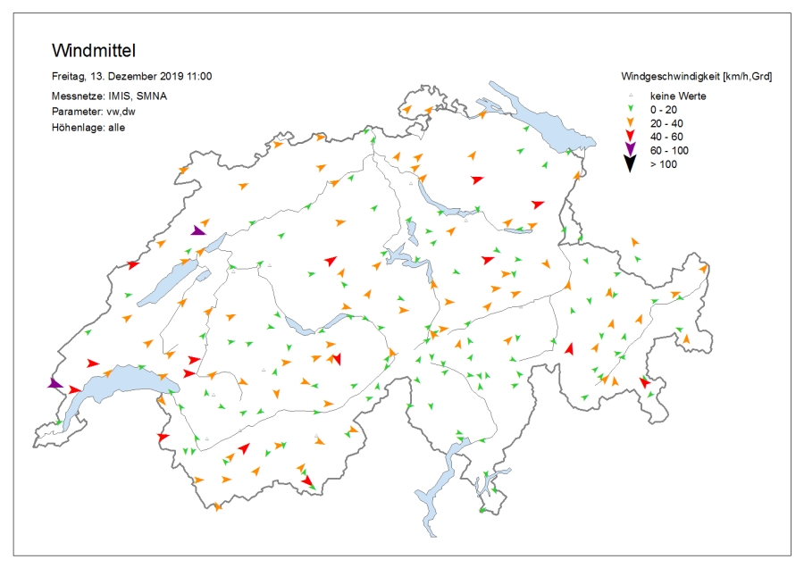 Le temps était très nuageux avec une succession de chutes de neige, surtout dans l’ouest et le nord. Le samedi, il y a eu des éclaircies surtout sur le versant sud des Alpes, dans les Grisons et sur l’ouest du versant nord des Alpes et dans le Jura. Dans certaines régions du Valais, il a encore neigé faiblement jusque dans l’après-midi. Le vendredi, la limite des chutes de neige était située à basse altitude sur le versant sud des Alpes et en Valais, et entre 800 et 1200 m ailleurs. Le samedi, elle a grimpé jusqu’aux alentours de 2000 m dans le Jura, dans les Alpes vaudoises et fribourgeoises et dans l’ouest du Bas-Valais, et à environ 1600 m ailleurs sur le versant nord des Alpes et en Valais. Sur le versant sud des Alpes et dans les Grisons, elle se situait aux alentours ou en dessous de 1000 m. Le vent était fort à tempétueux de secteur ouest à nord-ouest (cf. figures 1 et 2). Sur le versant nord des Alpes, un foehn fort de secteur sud soufflait le vendredi.