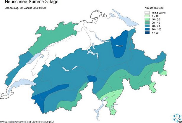 Le mardi et le mercredi, il y a eu en de nombreux endroits des chutes de neige jusqu'à basse altitude accompagnées d'un vent fort à tempétueux de secteur ouest. En l'espace de 48 heures, il est tombé au-dessus de 1400 m de 40 à 70 cm de neige sur une grande partie du territoire, et parfois jusqu'à 100 cm de neige dans le Bas-Valais, dans la région du Gothard ainsi que sur l'est du versant nord des Alpes (cf. figure 5).